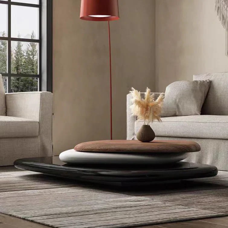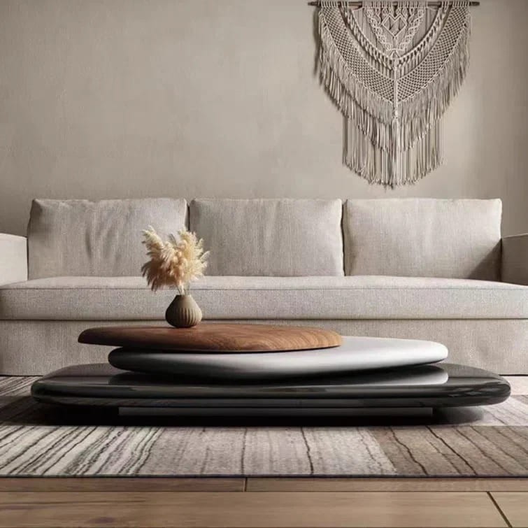 ترابيزة قهوة مصنوعة من خشب طبيعي عالي الجودة، بتصميم عصري مستوحى من الأشكال العضوية المتداخلة. تتكون من ثلاث طبقات متدرجة في الارتفاع بألوان متناسقة: بني، رمادي فاتح، وأسود، مما يضفي لمسة جمالية راقية على أي غرفة معيشة.