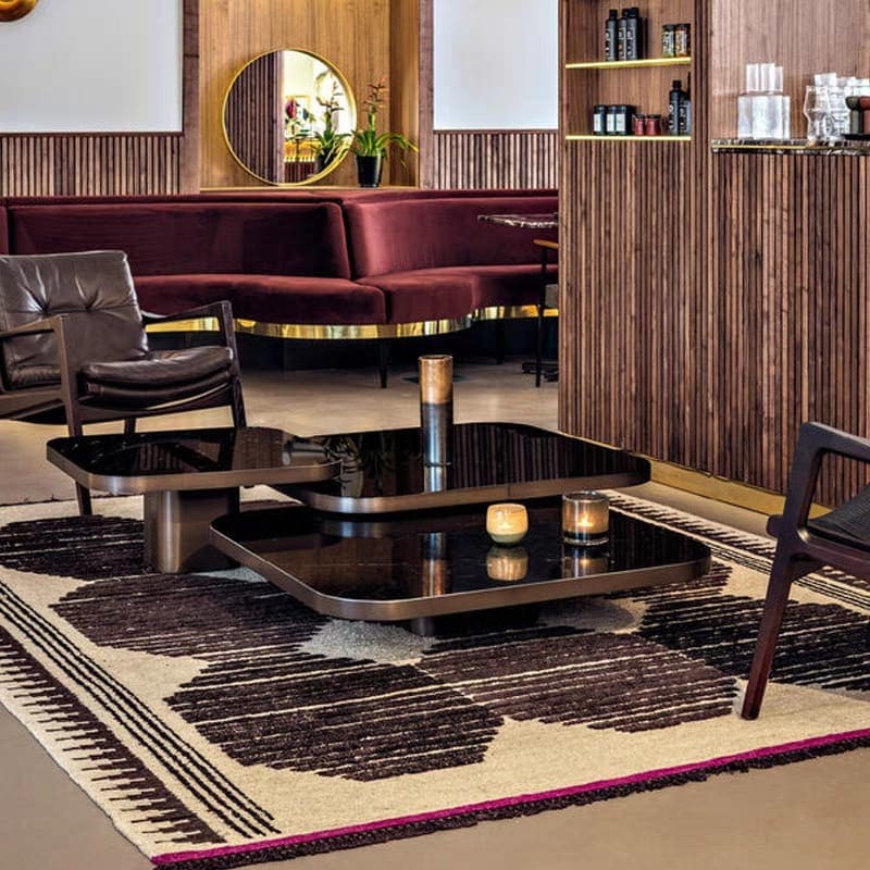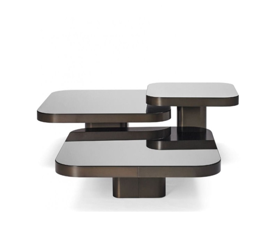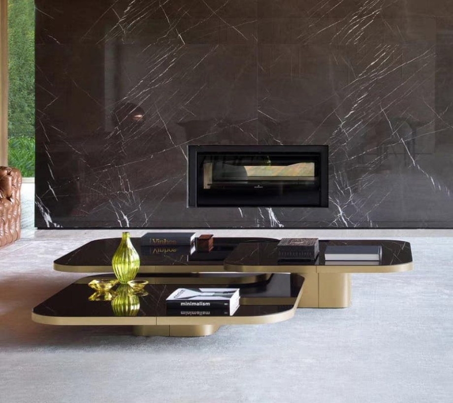مجموعة ترابيزات قهوة أنيقة تجمع بين الفخامة والعملية، بتصميم مستطيل الحواف المستديرة يمنحها مظهرًا انسيابيًا وعصريًا. مصنوعة من خشب طبيعي عالي الجودة، مع سطح من الزجاج الأسود اللامع يضفي لمسة راقية، ويحيط به إطار ذهبي أنيق يبرز التباين الجمالي ويُعزز من فخامة التصميم.