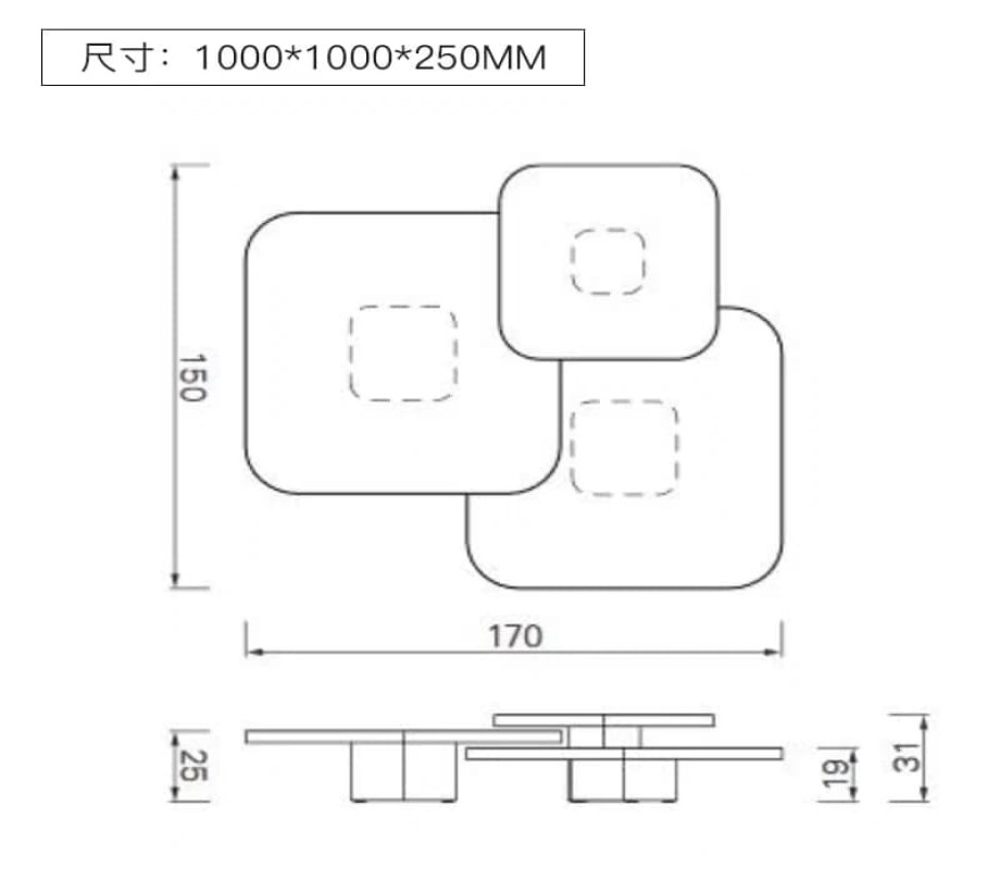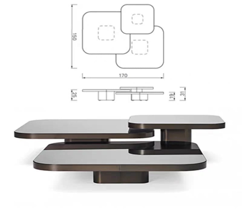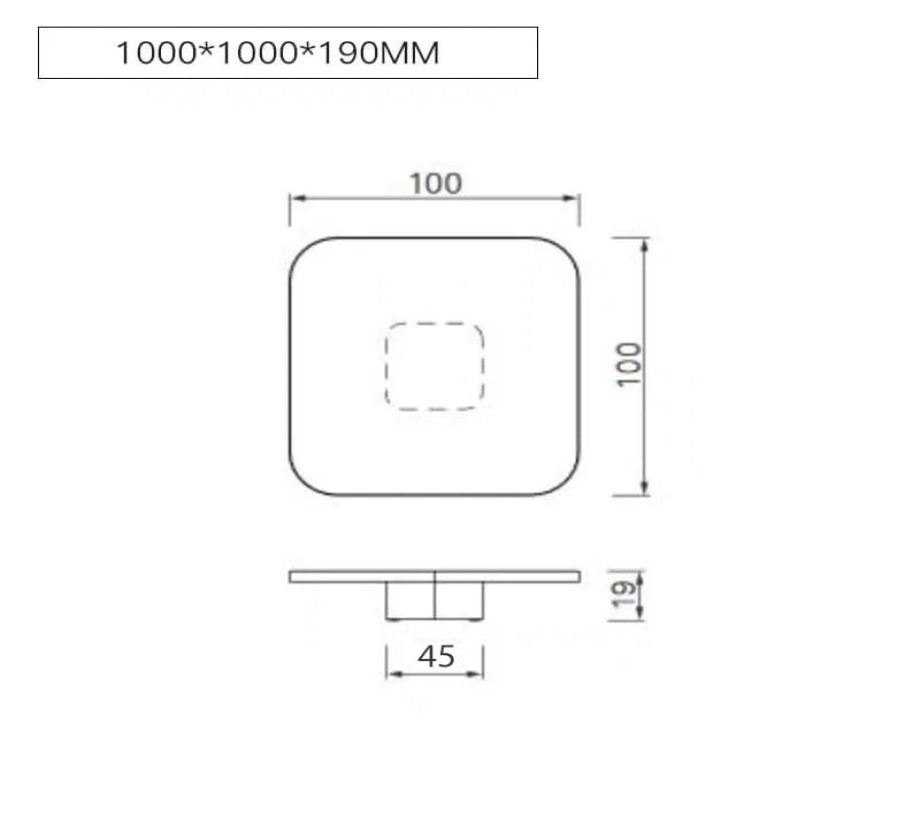 الطاولة المتوسطة: 100 سم (عرض) × 100 سم (عمق) × 19 سم (ارتفاع)