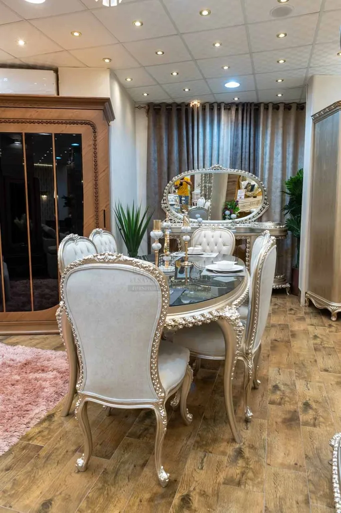 أضف لمسة من الرقي والأصالة إلى منزلك مع غرفة طعام كلاسيك متكاملة، مصنوعة بحرفية عالية وتفاصيل فنية تضيف هيبة وأناقة لكل ركن. التصميم الكلاسيكي يعكس الفخامة، والحفر اليدوي يعطي لكل قطعة روح خاصة.