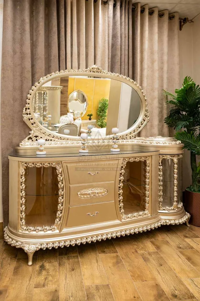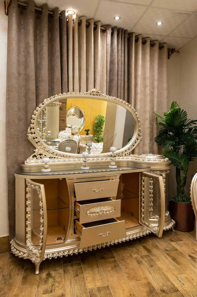 إطار كلاسيك فاخر للمرايا يكمّل تصميم البوفيه بشكل متناغم