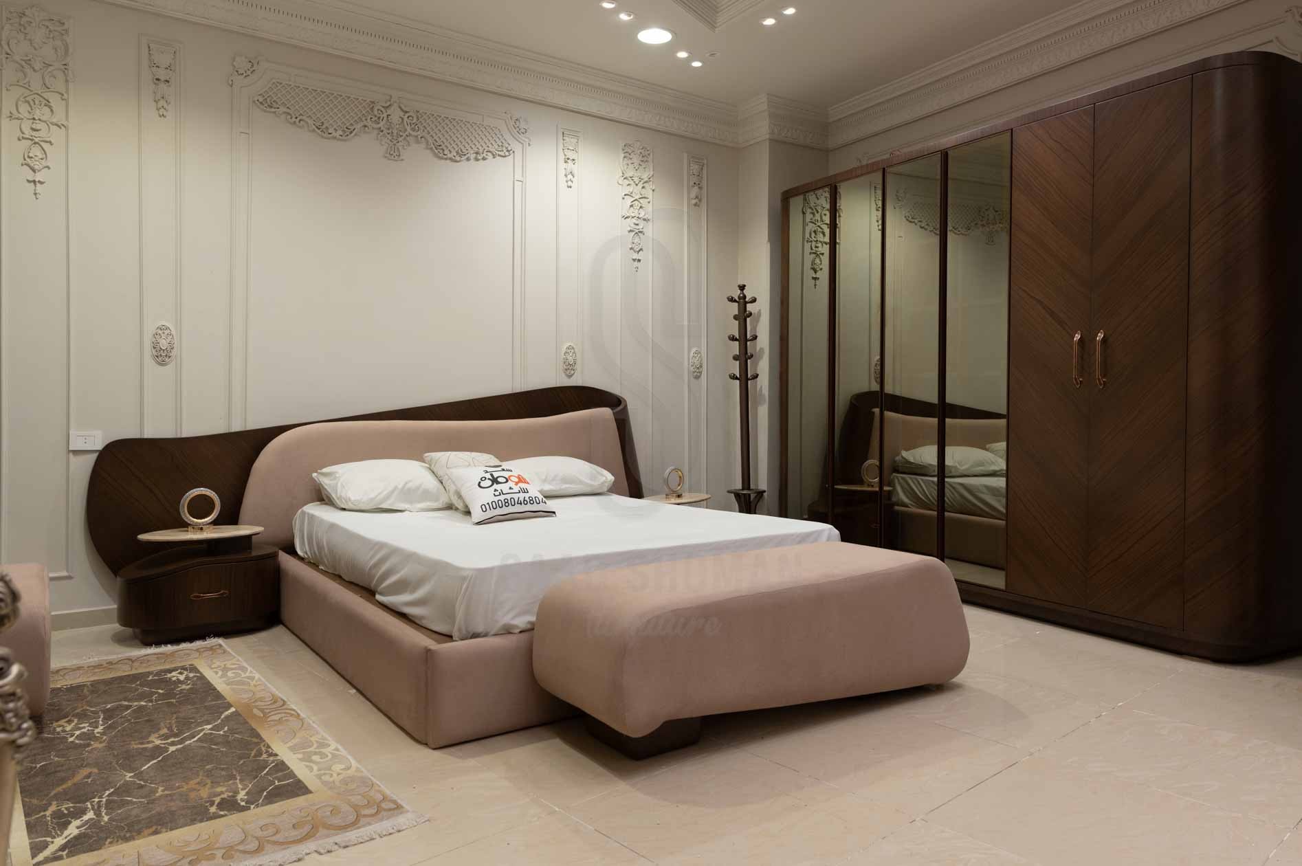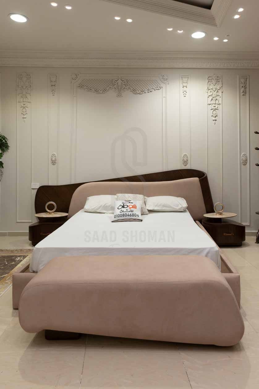 تتميز الغرفة بسرير بتصميم يجمع بين لوح رأس خشبي منحني بلون داكن وتنجيد وردي ناعم يضفي دفئًا وراحة، مع إطار سفلي مبطن يزيد من نعومة المظهر.