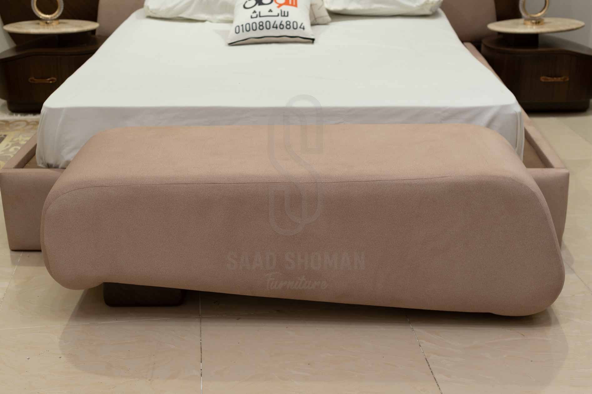 البانكيت مبطن بلون وردي متناغم مع السرير وقاعدة خشبية مستقرة، مثالي للجلسات المريحة.