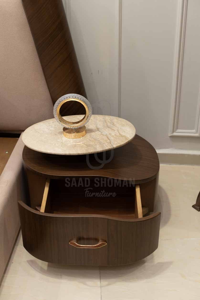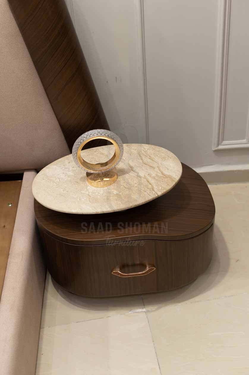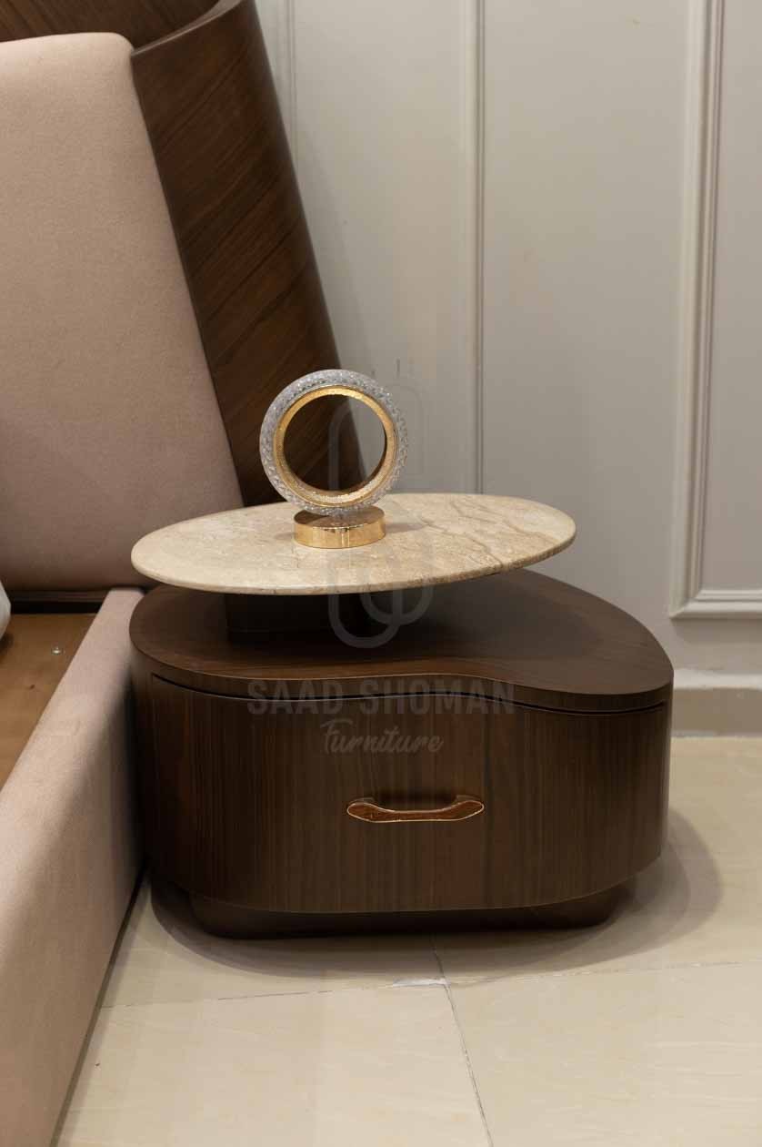 الكومود خشبي بلون داكن مع درج عملي وسطح رخامي أنيق لعرض المتعلقات اليومية.