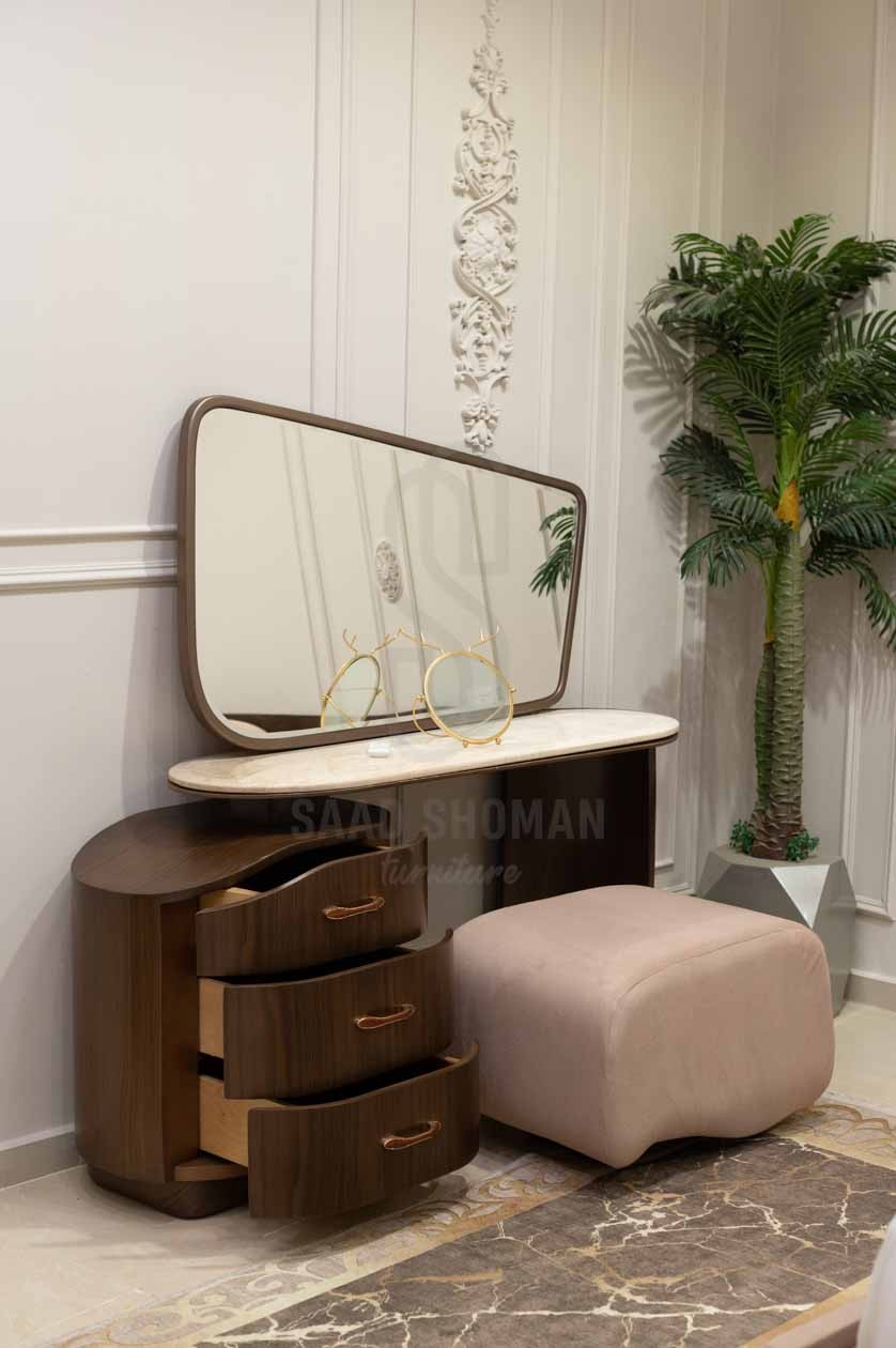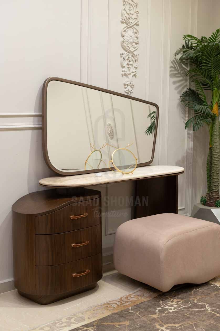 التسريحة مصممة بسطح رخامي وإطار مرآة خشبي مستطيل، تضم وحدة تخزين جانبية بثلاثة أدراج بمقابض ذهبية تضيف فخامة وعملية.