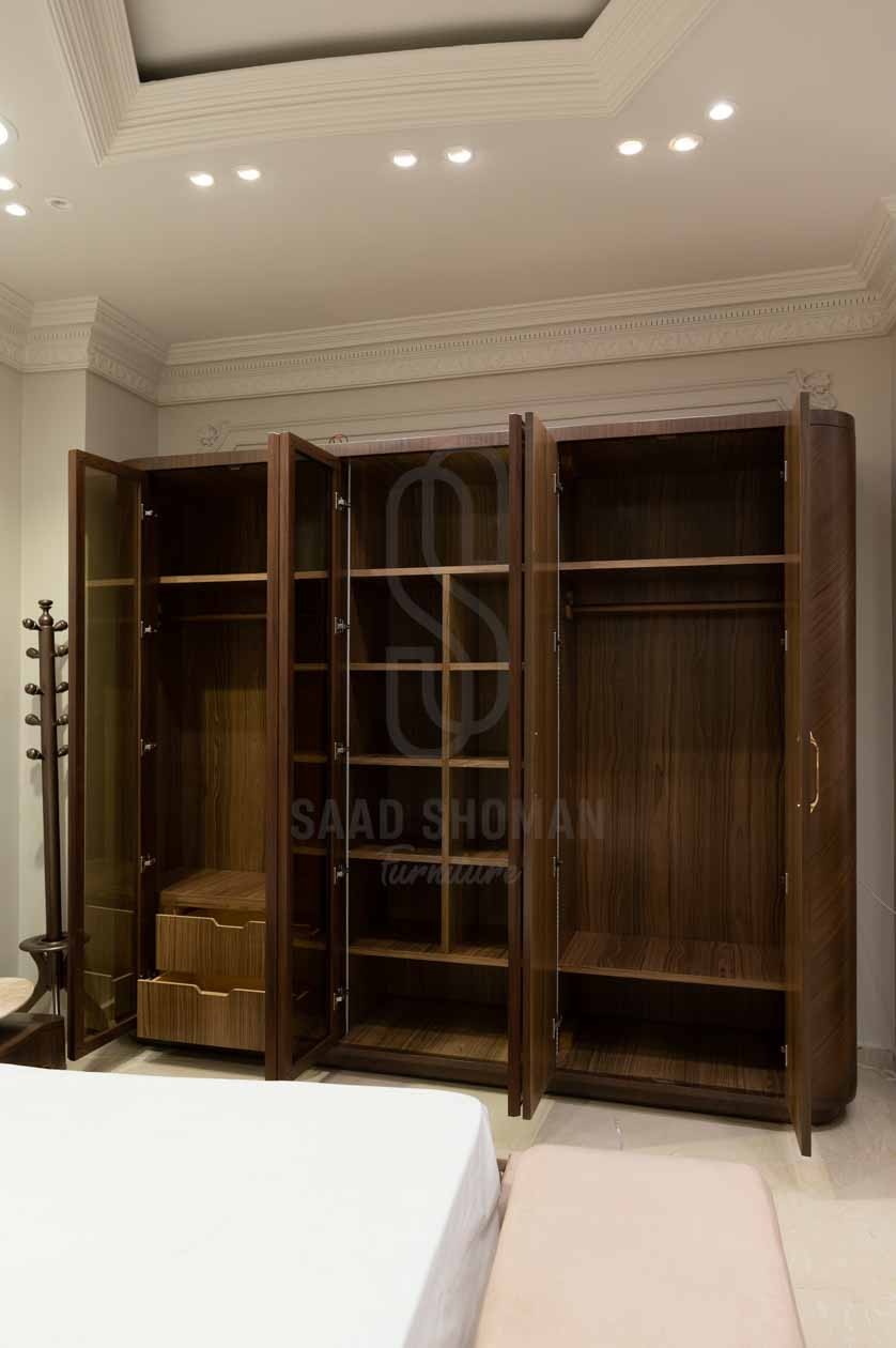 الدولاب واسع بأبواب من الخشب والمرايا، مع تنظيم داخلي مثالي.