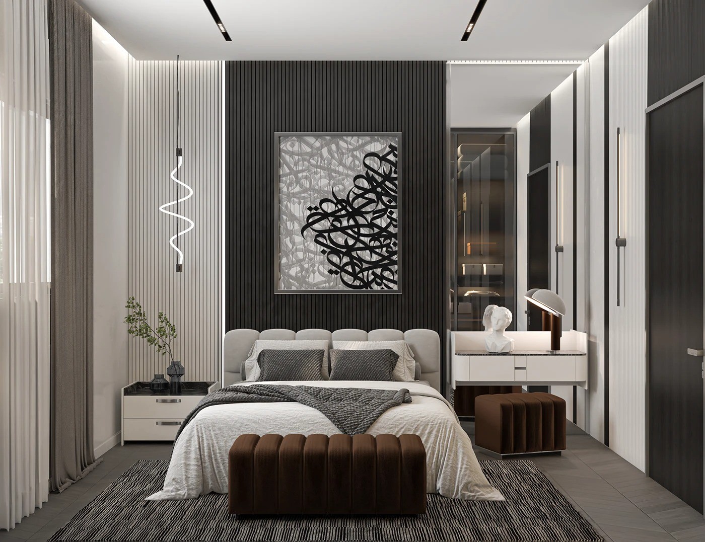 البف مبطن بلون متناسق مع السرير والتسريحة، بتصميم بسيط يوفر راحة وتكامل بصري للمساحة.