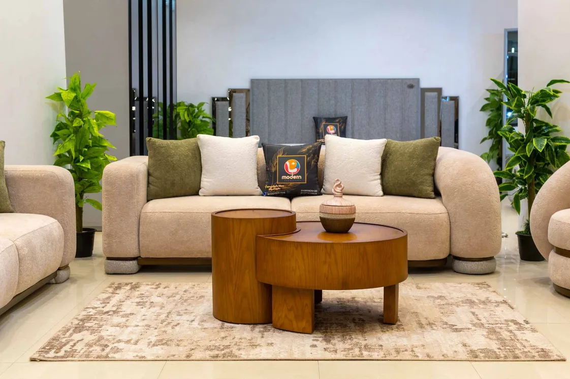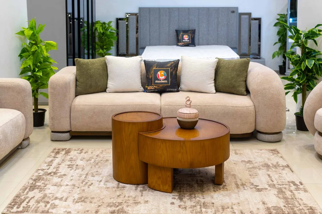 تتوسط المجموعة ترابيزة قهوة مزدوجة من الخشب، بتصميم دائري غير متماثل، تضيف لمسة فنية أنيقة. القطعتان مختلفتان في الارتفاع ومتداخلتان بطريقة تعكس روح التصميم العصري، مع سطح عملي يعزز من الاستخدام اليومي والجاذبية البصرية.