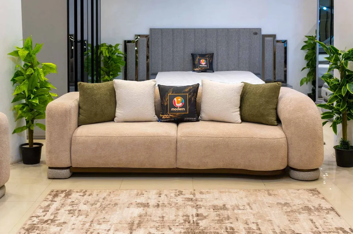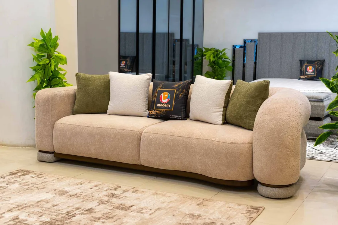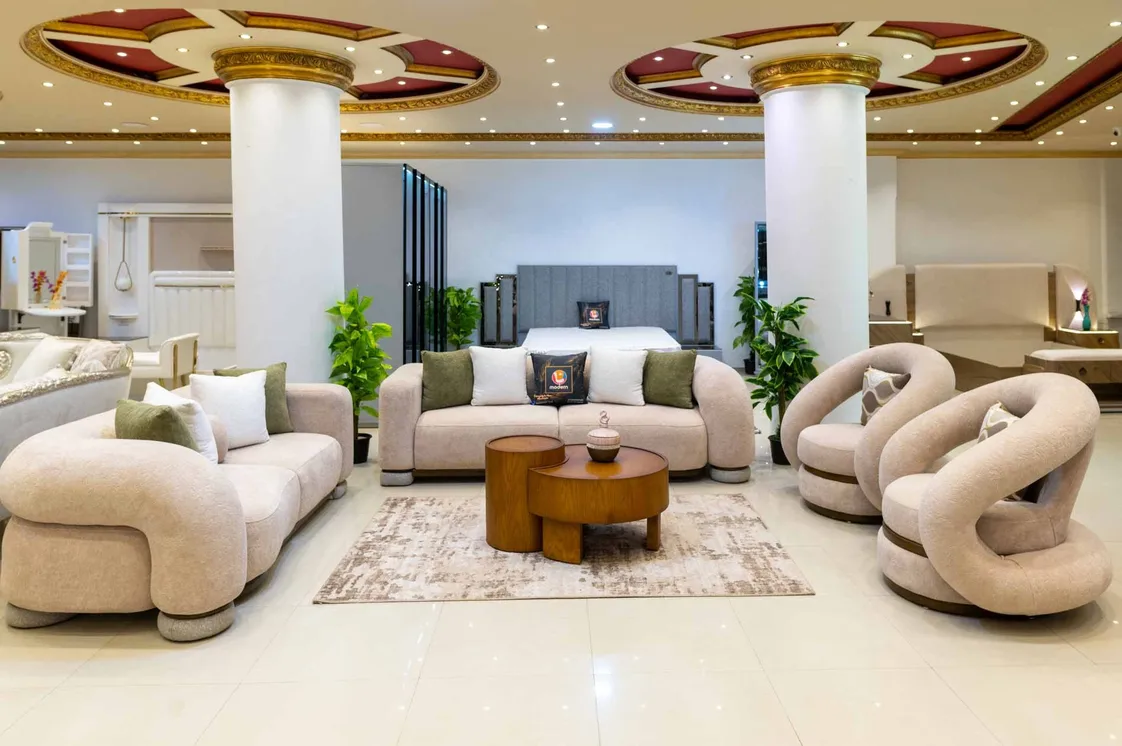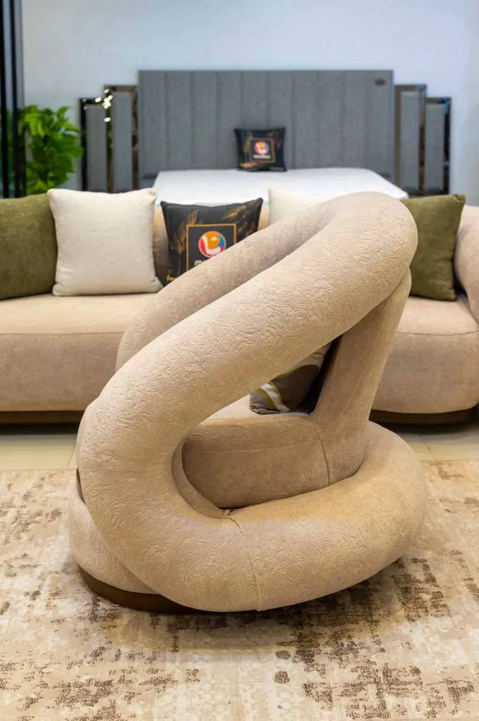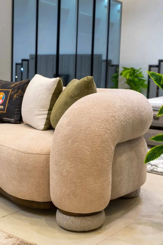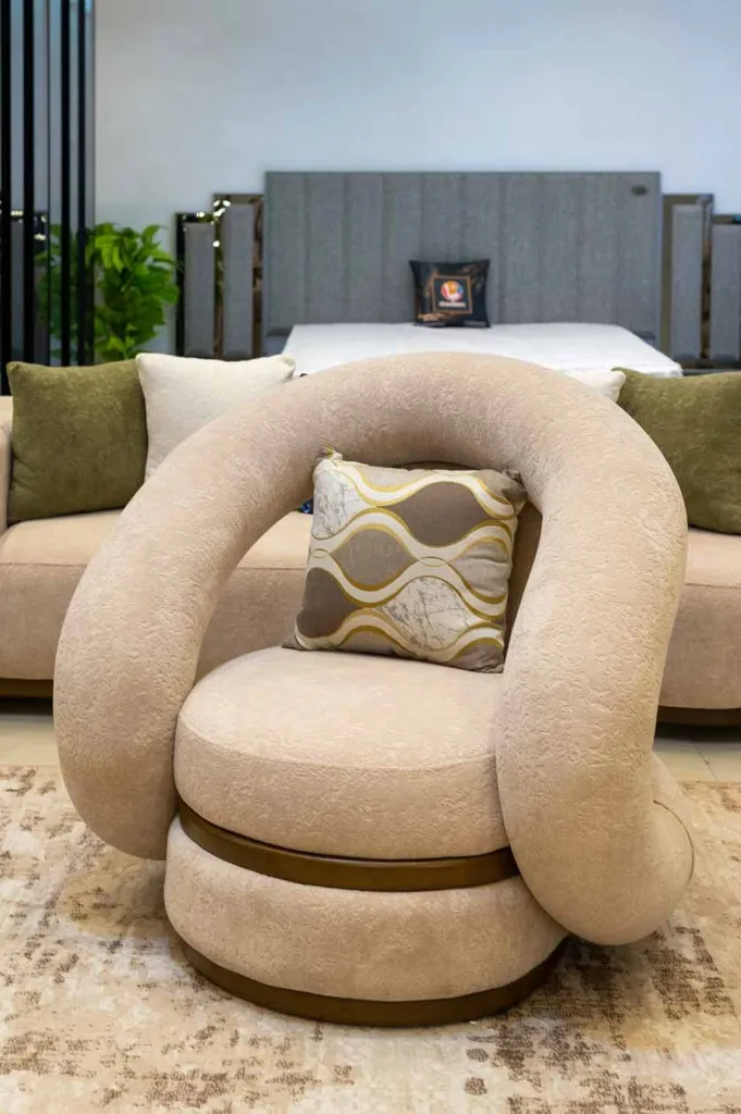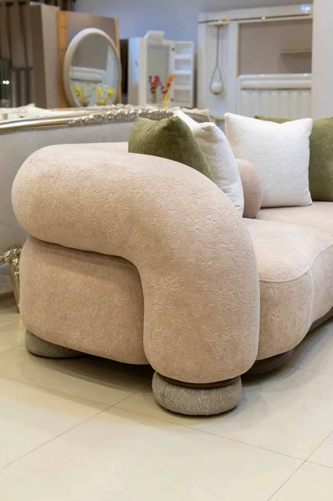تتكون هذه الغرفة من كنبتين بتصميم منحني مميز وكرسيين بذراعين بتكوين دائري جذاب. المساند والظهر مدمجة بشكل انسيابي يمنح الجلسة طابعًا ناعمًا وعصريًا. التنجيد المخملي الفاخر يعكس الراحة والأناقة، مع وسائد تضيف لمسة متناسقة وعملية.