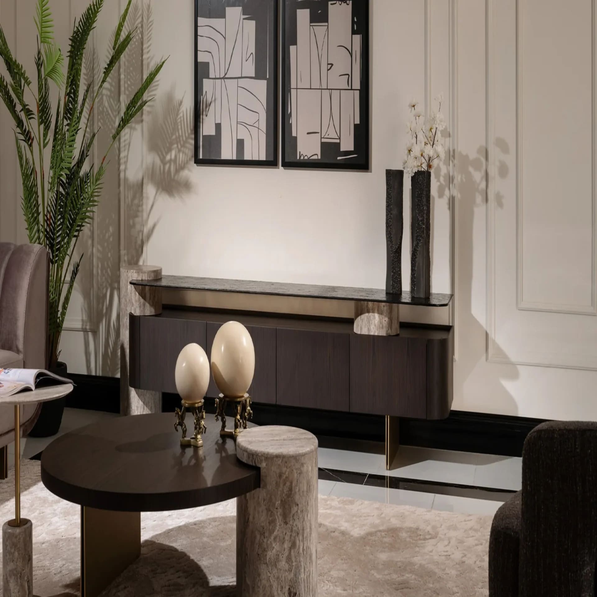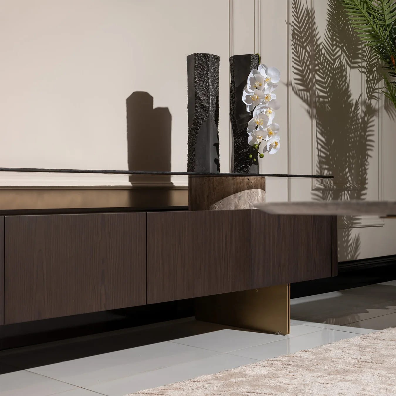 تتميز بسطح علوي أنيق من الزجاج مدعوم بقواعد جانبية فنية بتفاصيل رخامية، مع واجهة خشبية ناعمة تحتوي على وحدات تخزين عملية مغلقة. توازن مثالي بين الوظيفة والجمال يجعلها قطعة فنية في أي غرفة معيشة راقية.