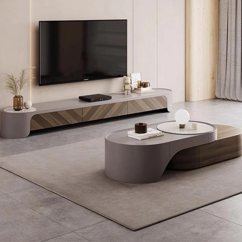 طقم أنيق مكون من وحدة تلفاز وترابيزة قهوة بتصميم عصري يجمع بين الأناقة والعملية، ليمنح غرفة المعيشة مظهرًا متناغمًا ودافئًا. يتميز الطقم بتدرجات الرمادي والبني التي تضفي لمسة من الفخامة والهدوء على المساحة.