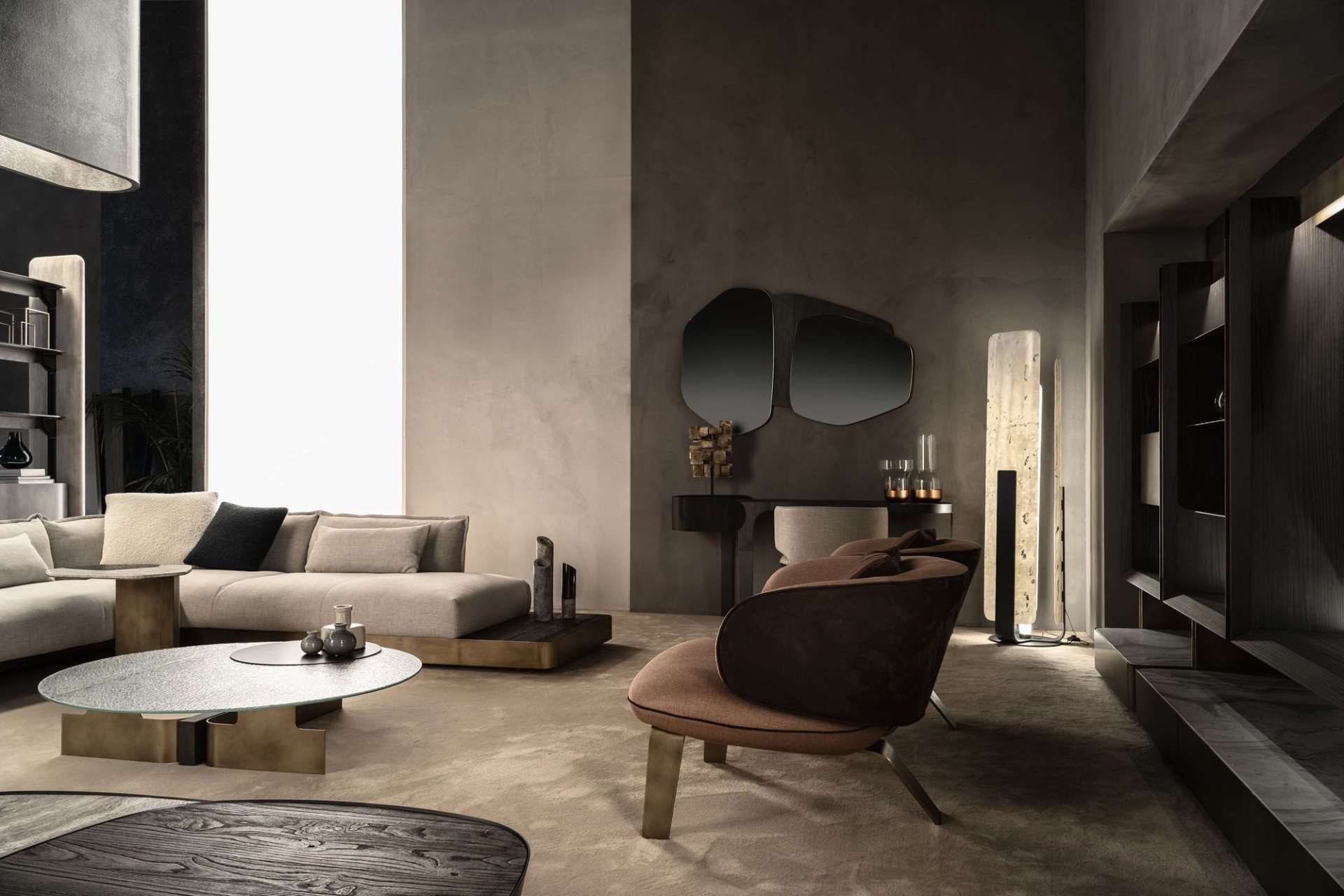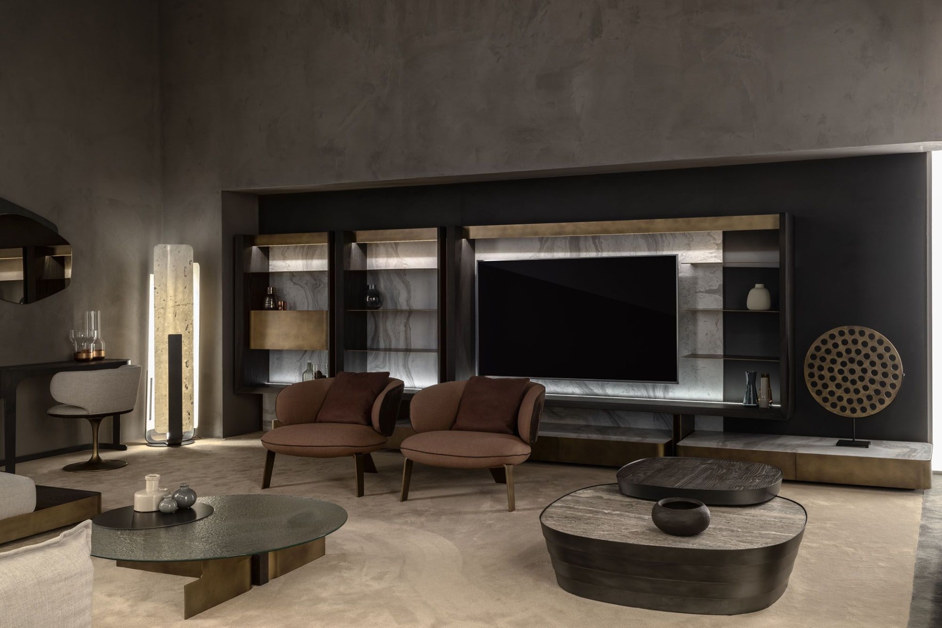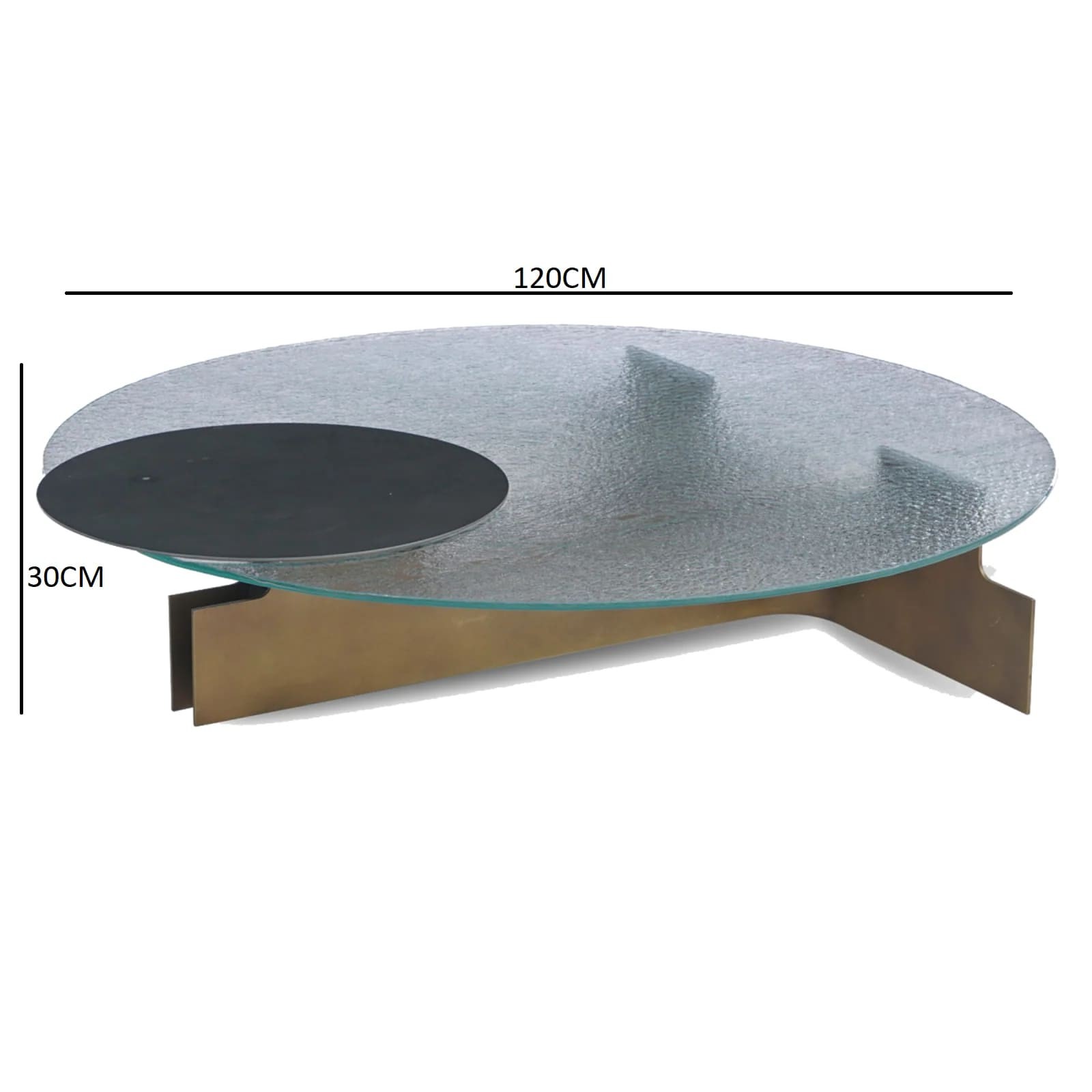 أضف لمسة من الفخامة الفنية إلى غرفة المعيشة مع هذه الترابيزة الدائرية الفريدة. يأتي سطح الطاولة من زجاج محفور عالي الجودة، شفاف الملمس بلمسة فنية، يطفو بأناقة فوق قاعدة معدنية أنيقة ومفتوحة. القاعدة مصممة على شكل إطار معدني بلون ذهبي غير لامع، مما يمنح الطاولة مظهرًا هندسيًا عصريًا. تكتمل التفاصيل بلمسة دائرية سوداء تعلو جزءًا من السطح، تضيف تباينًا بصريًا جذابًا.