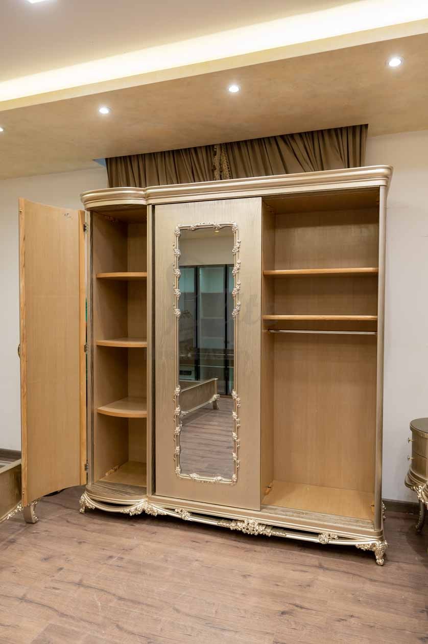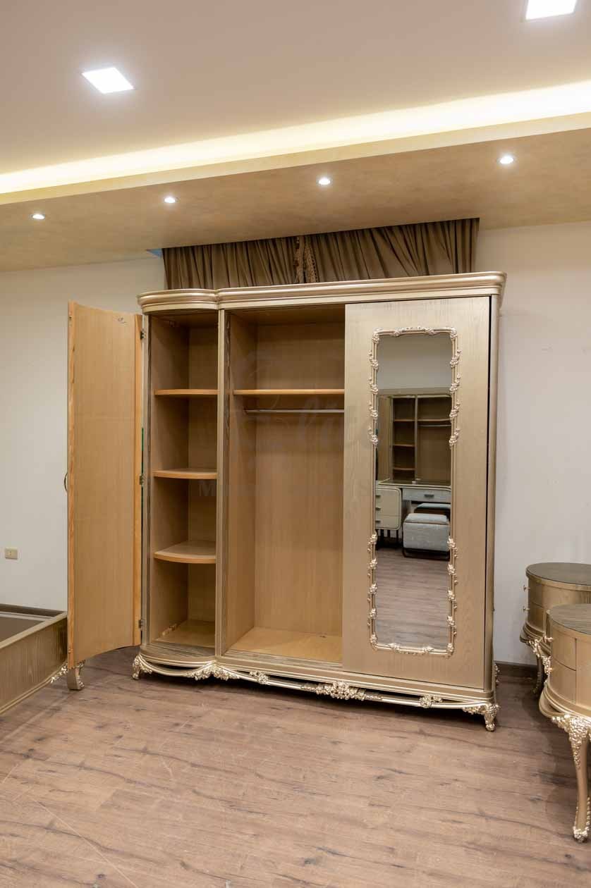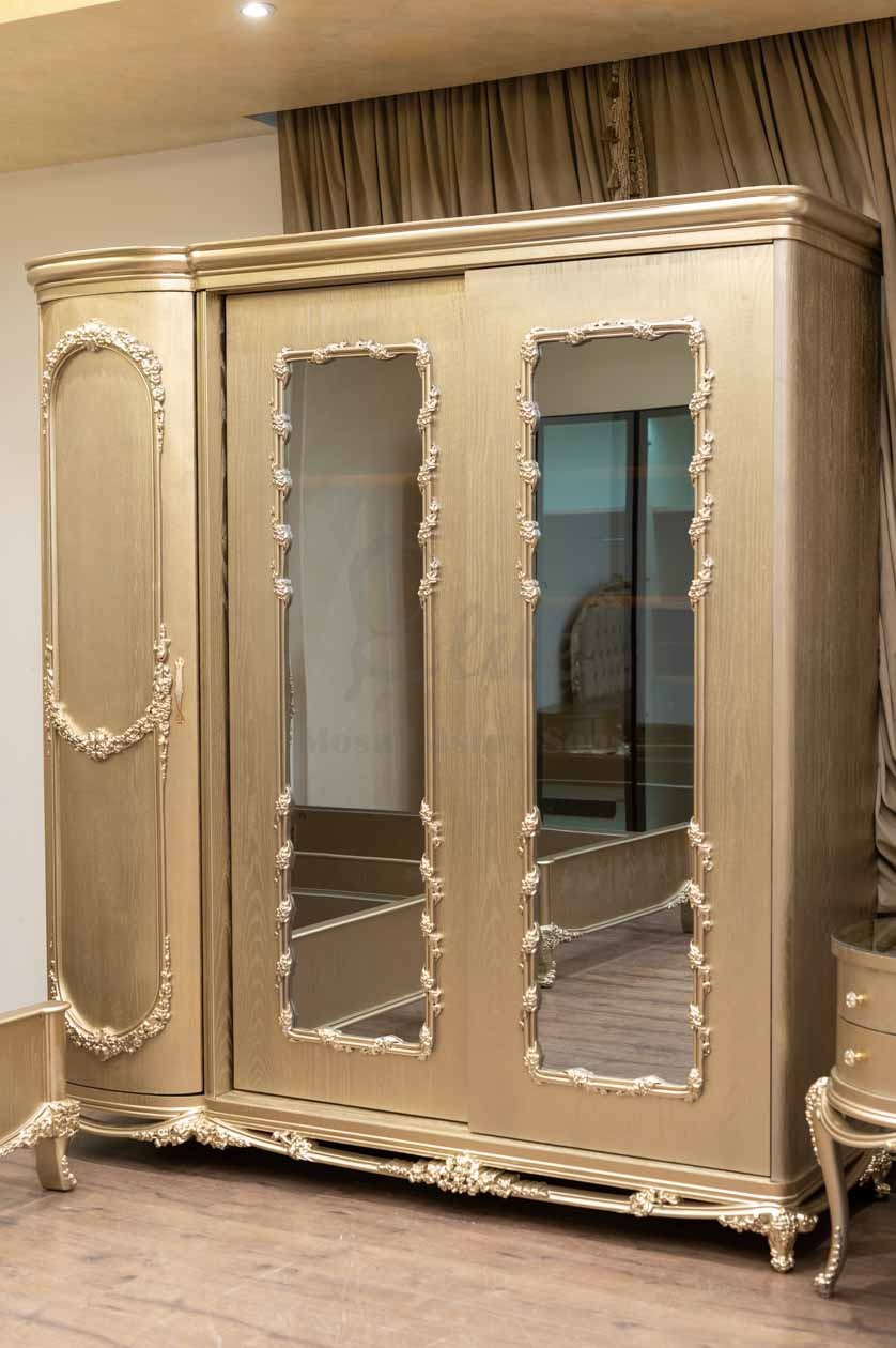 أما الدولاب، فهو كبير بثلاثة أبواب، بتصميم ذهبي متناغم، وتغطي المرايا الكبيرة واجهته لتعكس الضوء وتعزز الإحساس بالاتساع، وتُحيط بها إطارات مزخرفة تضيف لمسة فنية.
