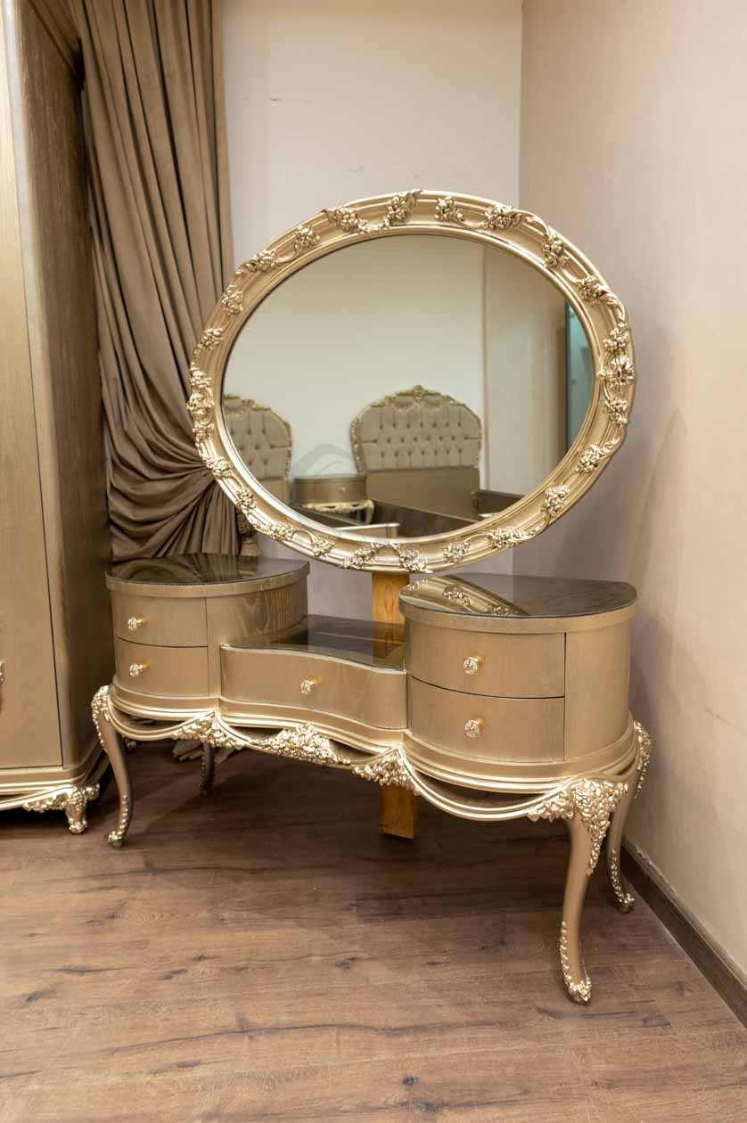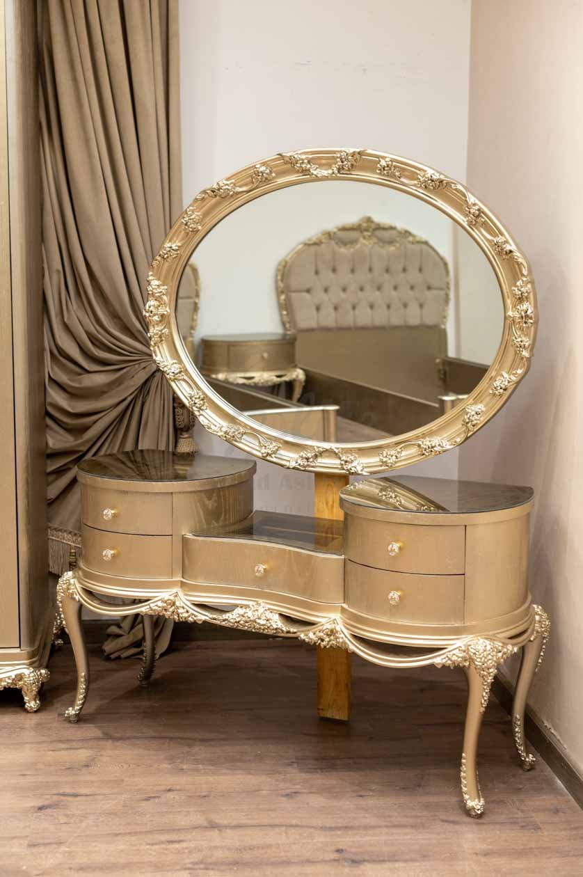 تأتي التسريحة بلمسة ذهبية لامعة، تتوسطها مرآة بيضاوية مزينة بزخارف زهرية. تحتوي على درج مركزي صغير، وعلى جانبيها أدراج صغيرة متعددة بمقابض ذهبية تتناغم مع الطلاء العام. الأرجل المنحنية مزخرفة، والسطح العلوي المغطى بالزجاج يعكس الضوء ببريق ناعم، ما يضيف لمسة براقة للتصميم الكلي.