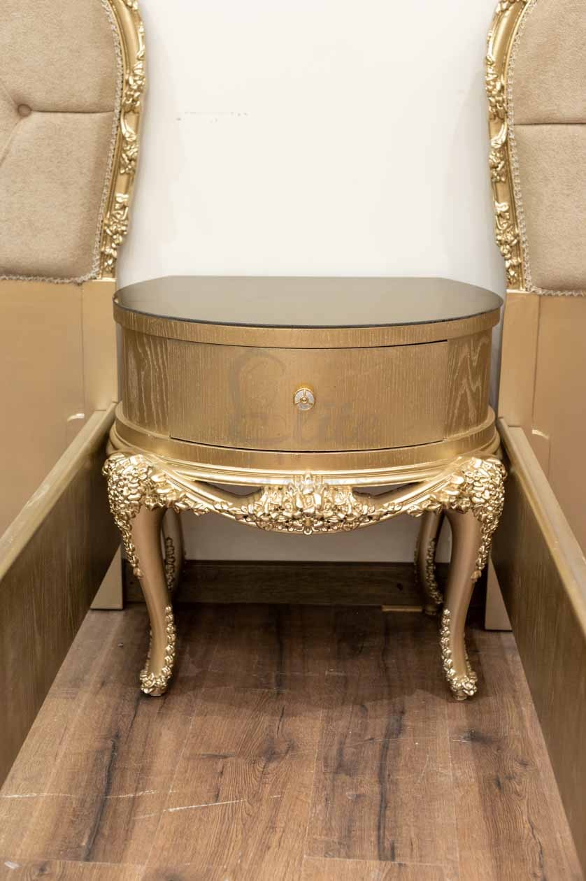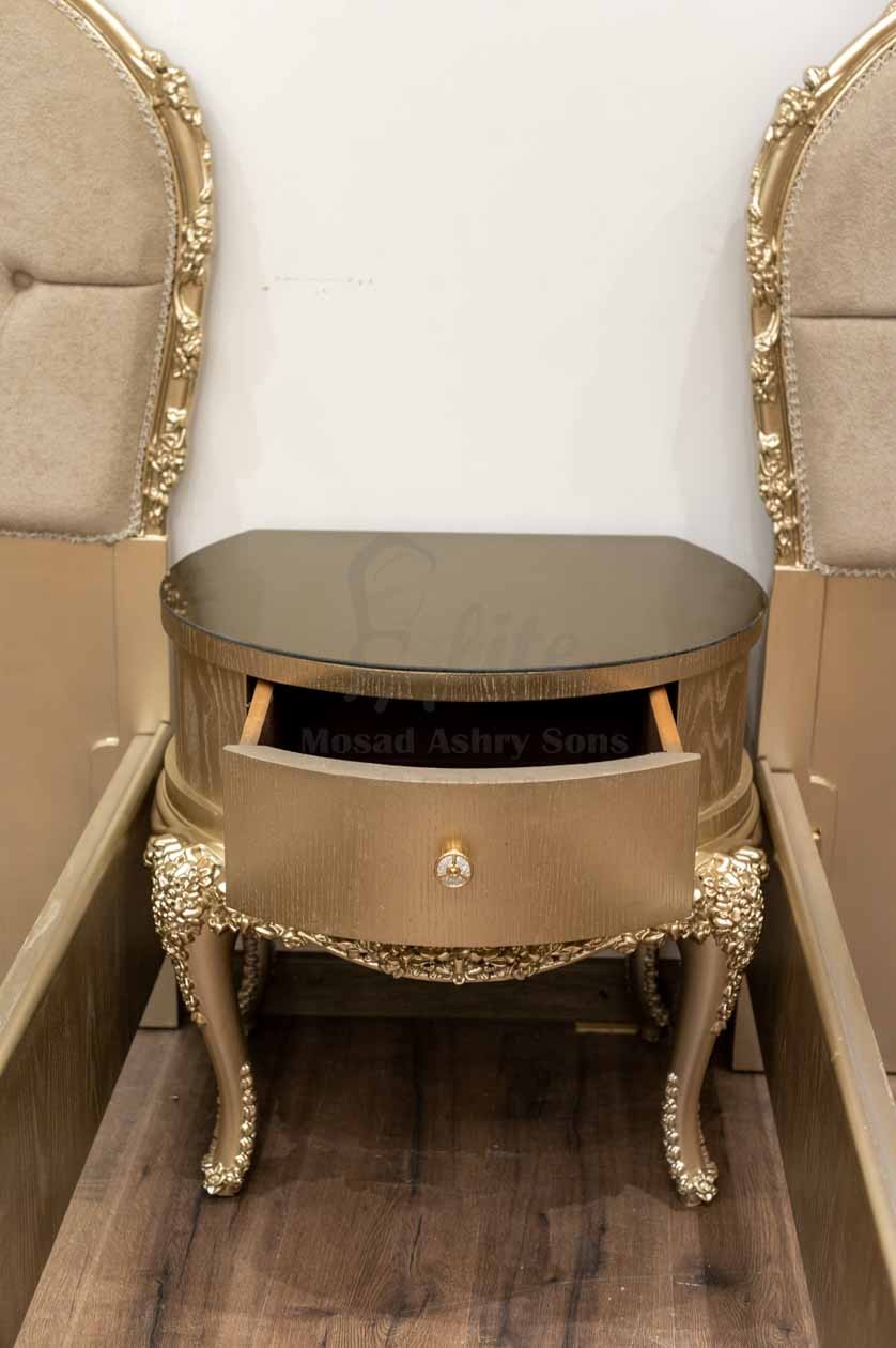 غرفة نوم متكاملة تجمع بين الفخامة الكلاسيكية والتفاصيل الراقية، حيث يتميز السريران الخشبيان بلون ذهبي لامع يعكس الأناقة، مع رأسية منجدة بالقماش البيج مزينة بأزرار بارزة تمنحهما لمسة كلاسيكية ناعمة. تأتي الأرجل بزخارف منحوتة تضيف طابعًا تقليديًا متقنًا.