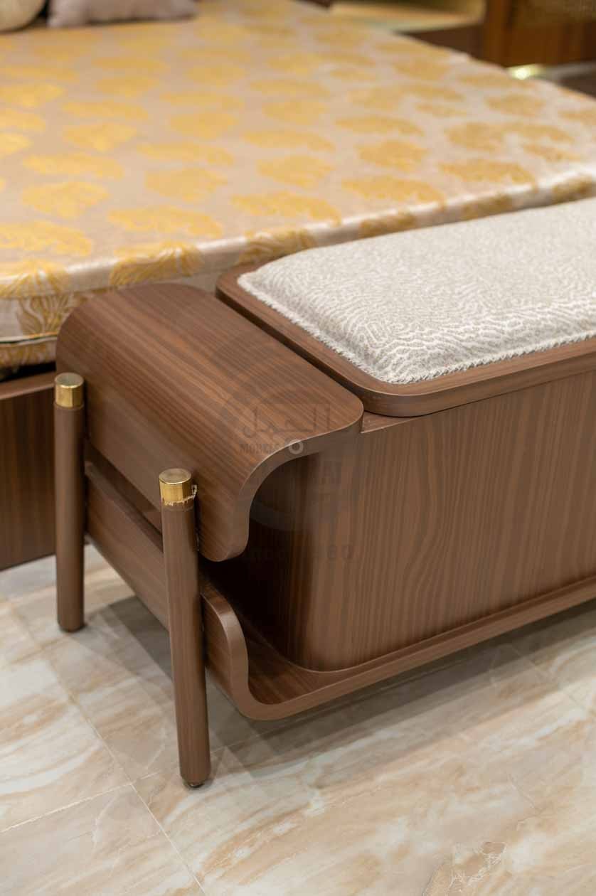 الكومود: قطعة خشبية أنيقة بدرج واحد بمقبض ذهبي بسيط، يعلوه رف مفتوح بإضاءة LED تضيف لمسة راقية.