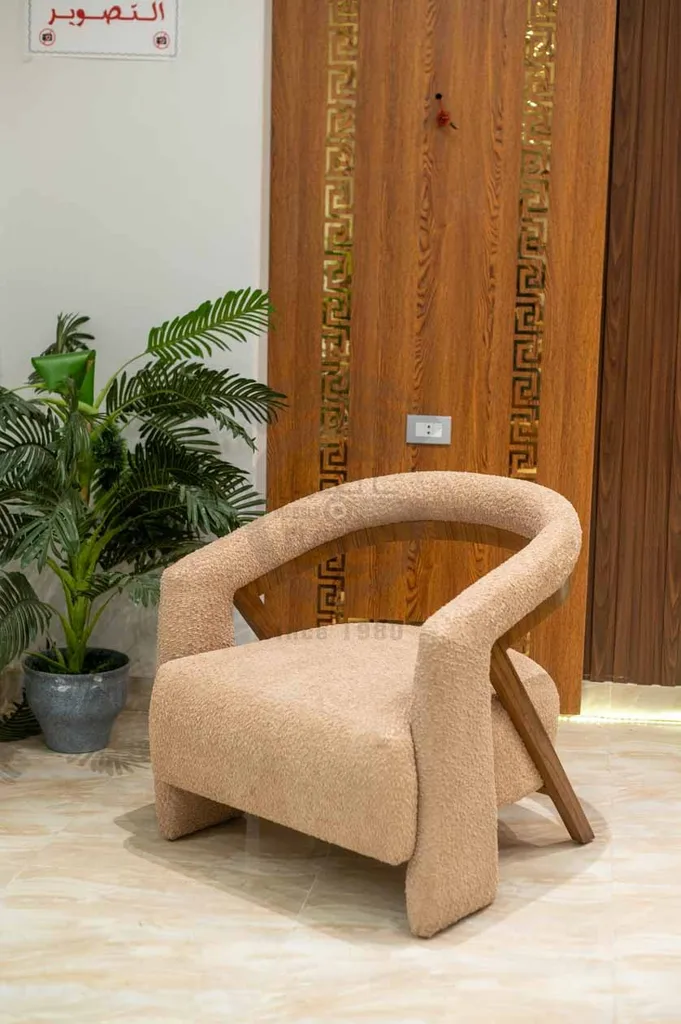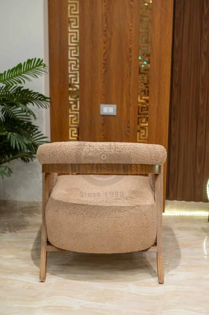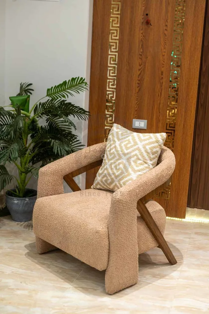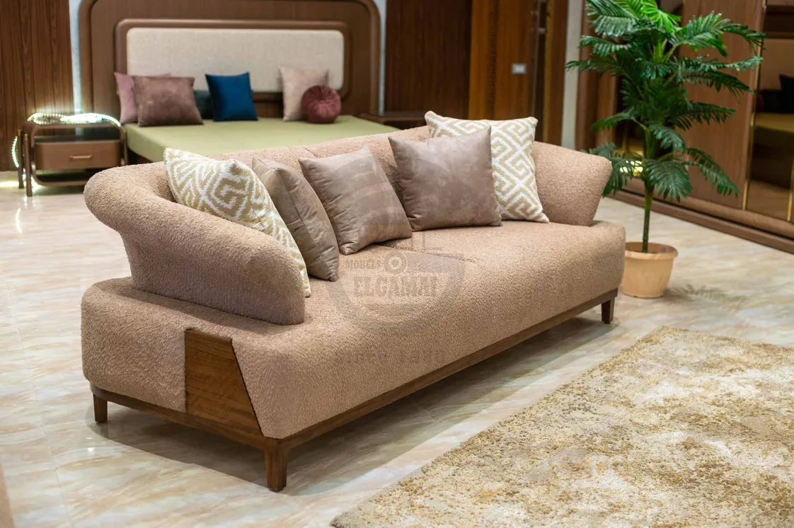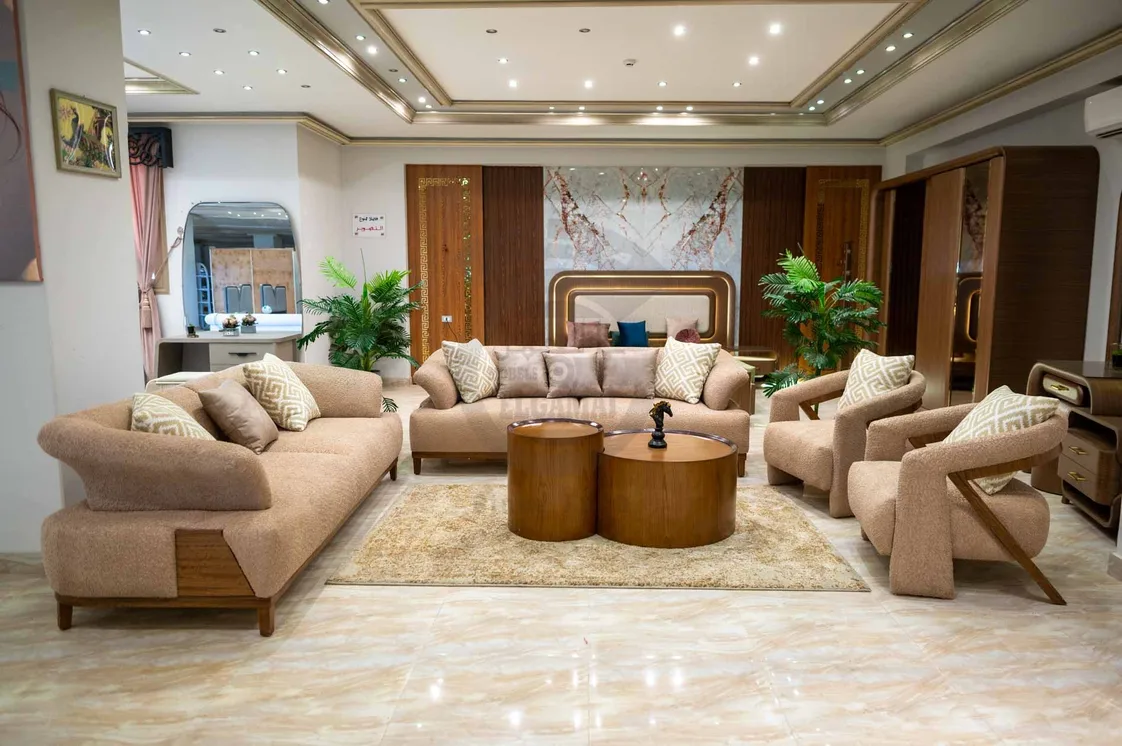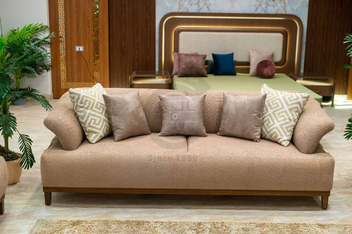 يكتمل الطقم بوسائد ديكورية باللون البيج والنقوش الذهبية الهندسية، مما ينسجم تمامًا مع ألوان التنجيد الدافئة. تم تصنيع الطقم من خامات عالية الجودة وهياكل خشبية قوية لضمان المتانة والأناقة في آن واحد، ليكون الخيار المثالي لغرف المعيشة المودرن.