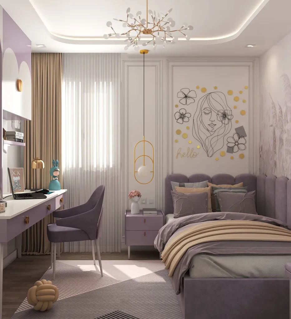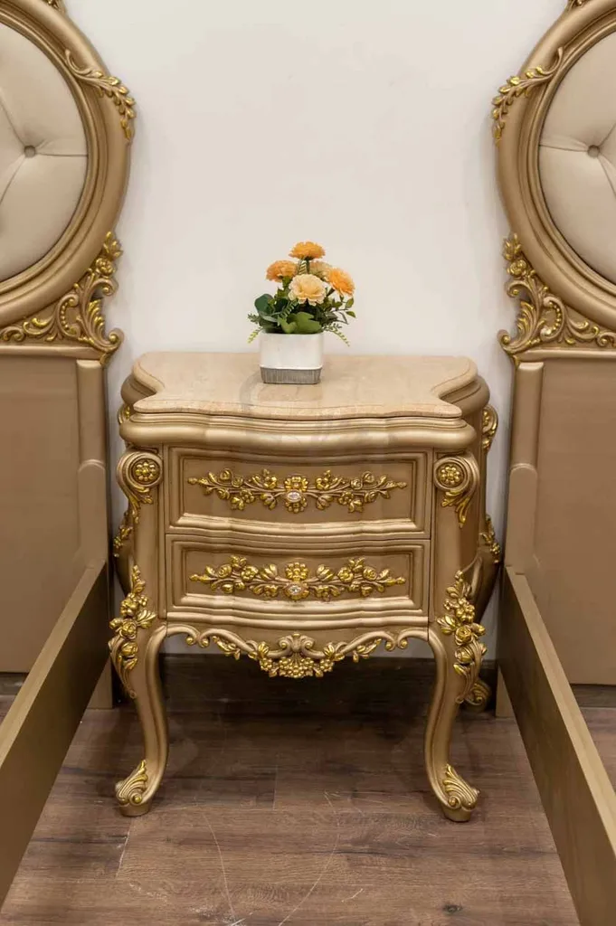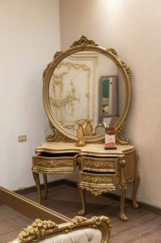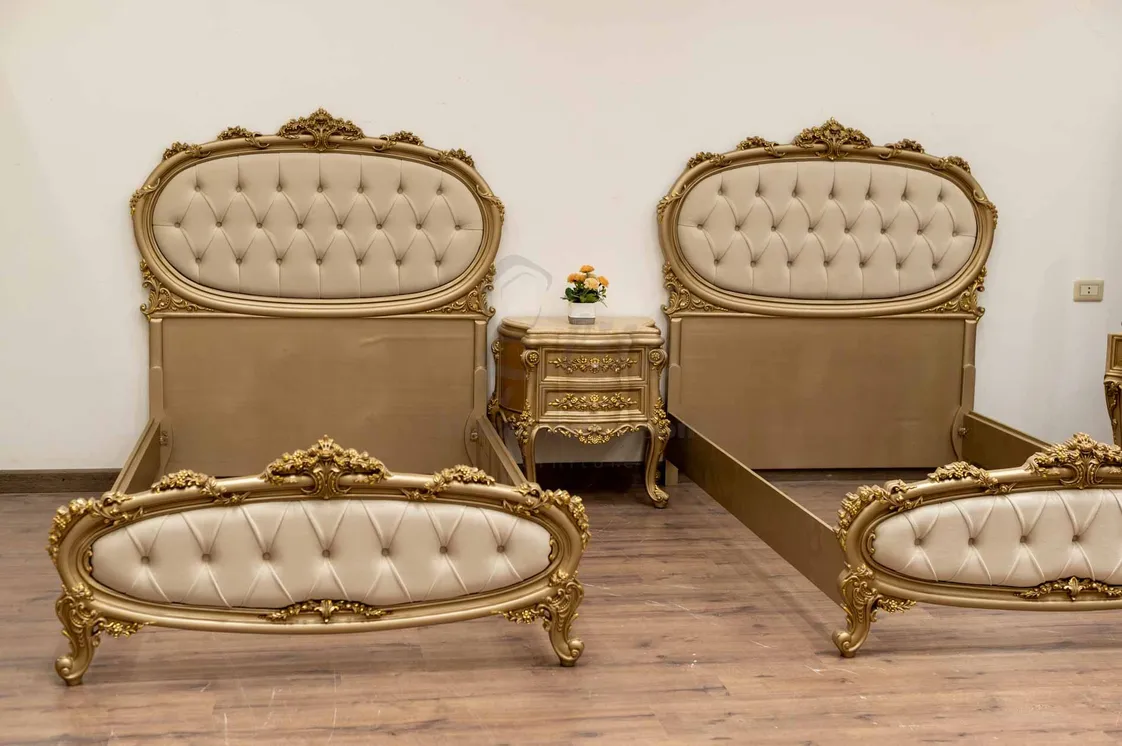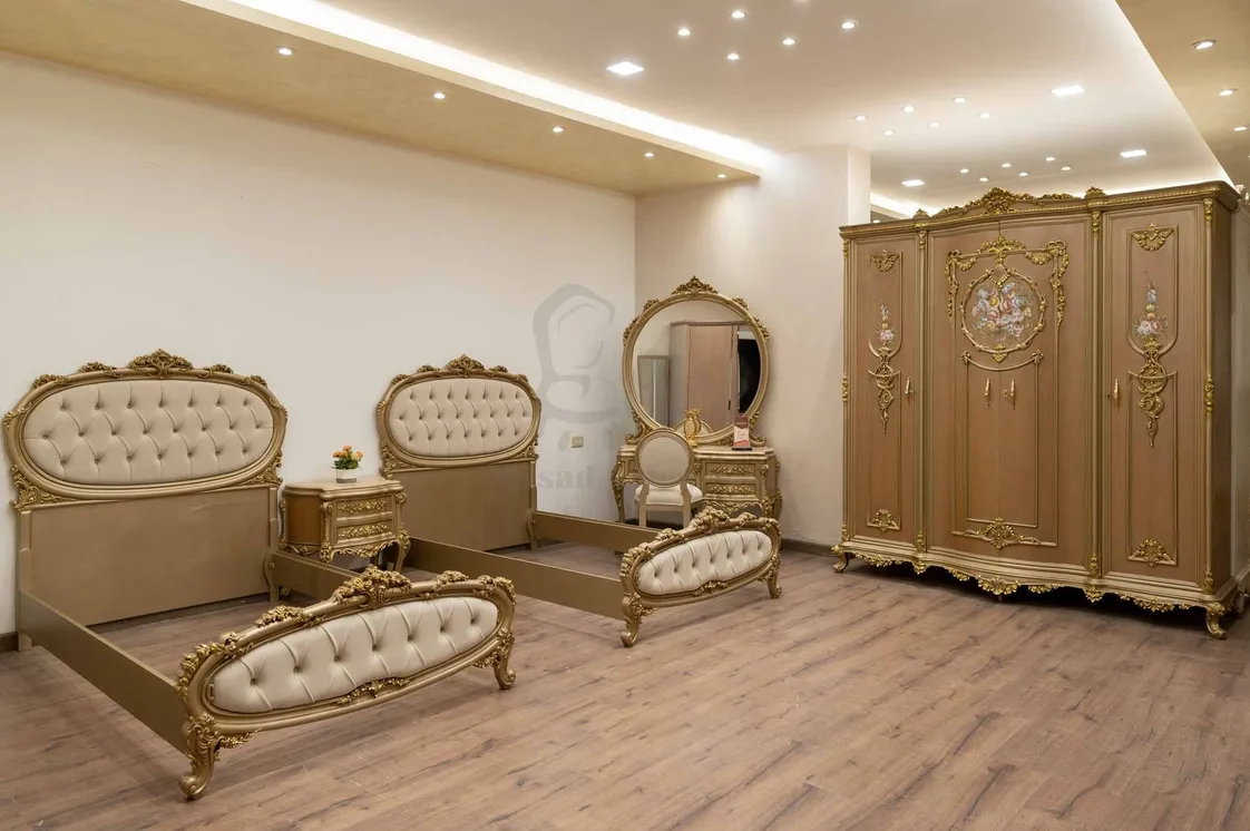 يكتمل التصميم بـ كومود أنيق، وتسريحة عملية مزودة بمرآة تعكس جمال الغرفة، بالإضافة إلى دولاب واسع يوفر مساحة تخزين مثالية. اللون الجولد الفاخر يضفي إشراقة خاصة وينسجم مع الطابع الكلاسيكي للغرفة، مما يجعلها خيارًا مثاليًا لشباب وأطفال يعشقون اللمسات الملكية.