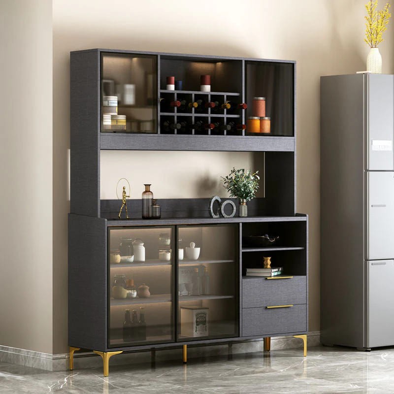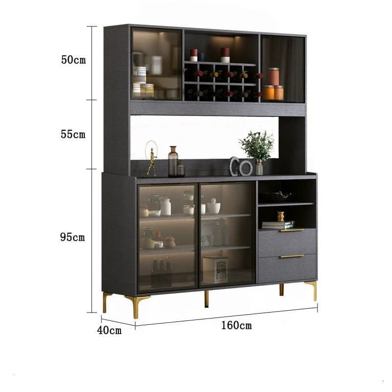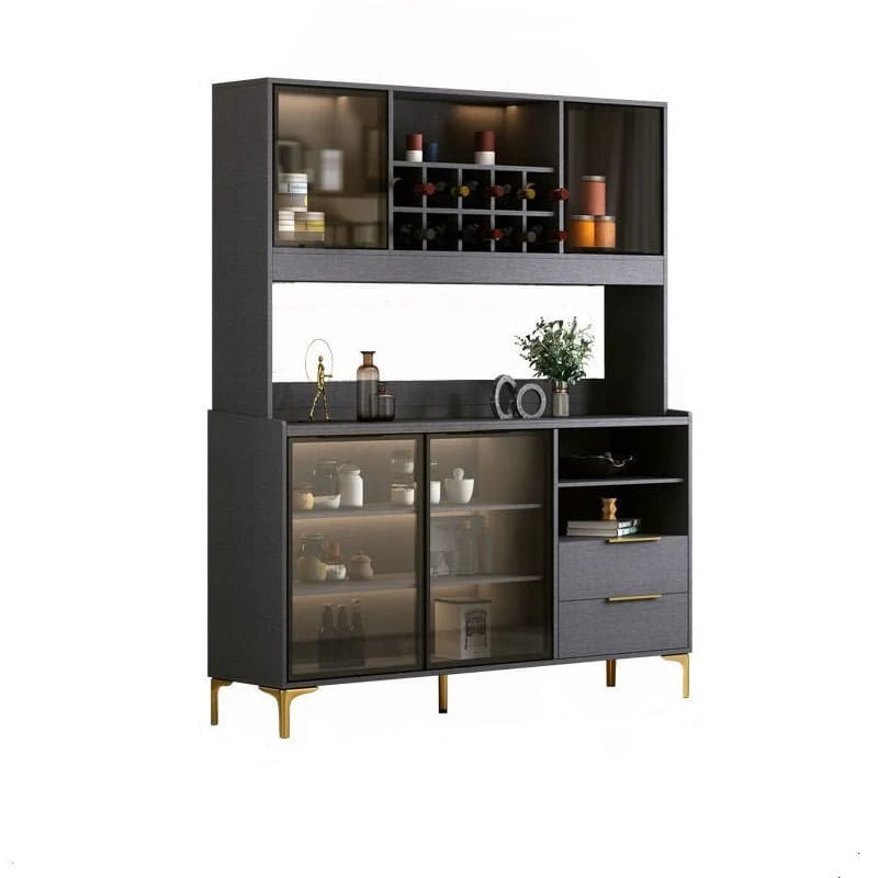أضف لمسة من الرقي والفخامة إلى منزلك مع ركن القهوة العصري المصمم بعناية. يتميز بوجود رفوف وأدراج متعددة لتوفير تنظيم عملي وفعال لأدوات القهوة والإكسسوارات. مصنوع من مواد عالية الجودة تشمل الخشب الطبيعي، الزجاج والمعادن، ويأتي بلون أسود أنيق مع تفاصيل ذهبية تضفي طابعًا فاخرًا على أي مساحة.
