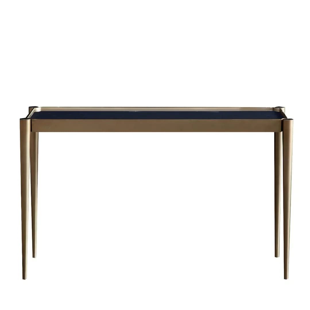 إطار معدني ذهبي متين مع سطح رخامي أسود أنيق.