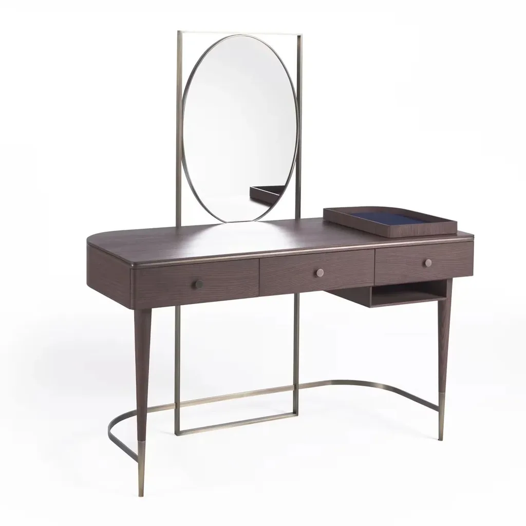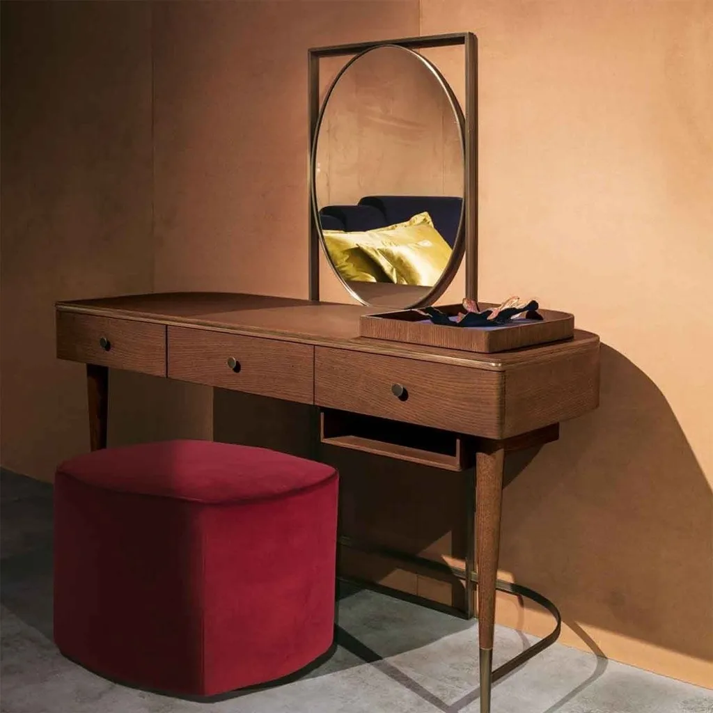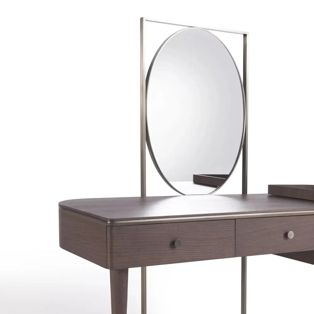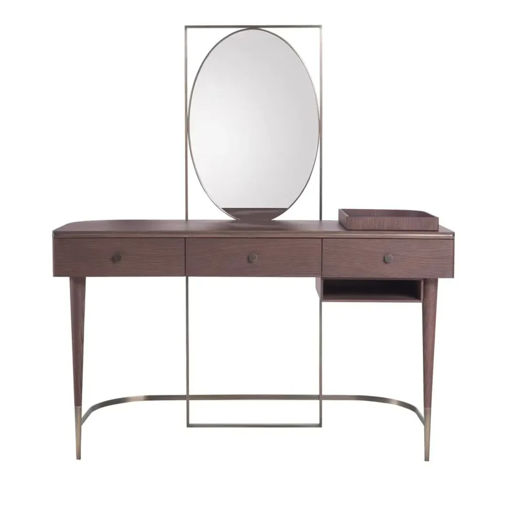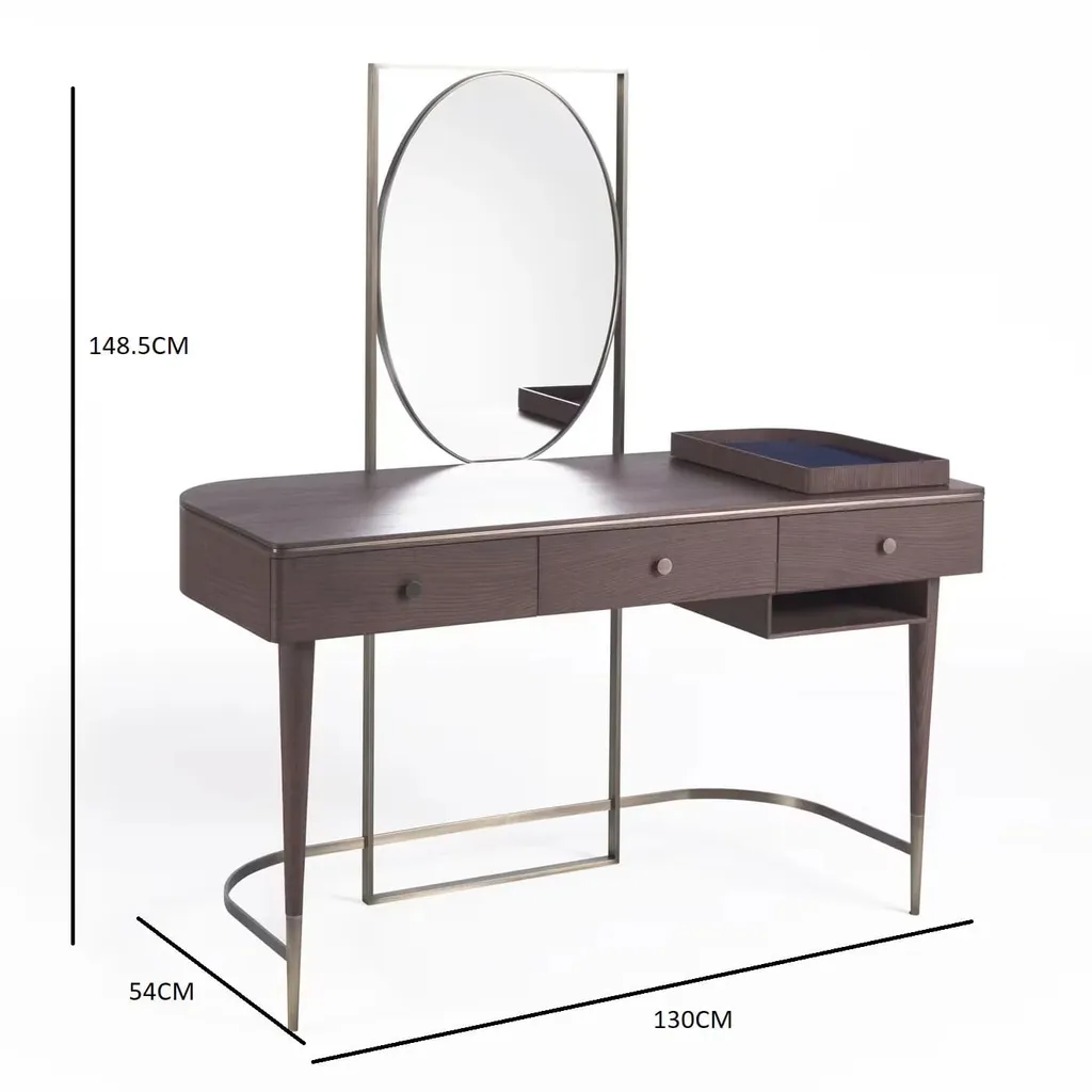 تُضفي هذه التسريحة الفاخرة لمسة من الأناقة والرقي على أي غرفة نوم. بتصميم عملي وجذاب، توفر مساحة واسعة لعرض مستحضرات التجميل والإكسسوارات وتنظيمها بسهولة. مصنوعة من خشب طبيعي عالي الجودة مع تفاصيل من الفولاذ المقاوم للصدأ، مما يجمع بين المتانة والجمال في قطعة واحدة. يضيف لونها البني العميق إحساسًا بالدفء والترف، مما يجعلها مثالية للتنسيق مع مختلف أنماط الديكور الداخلي.