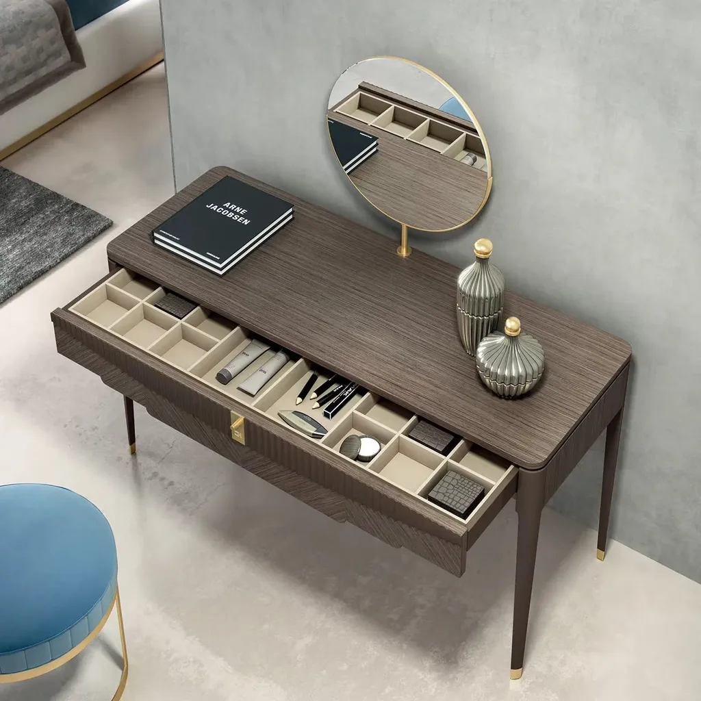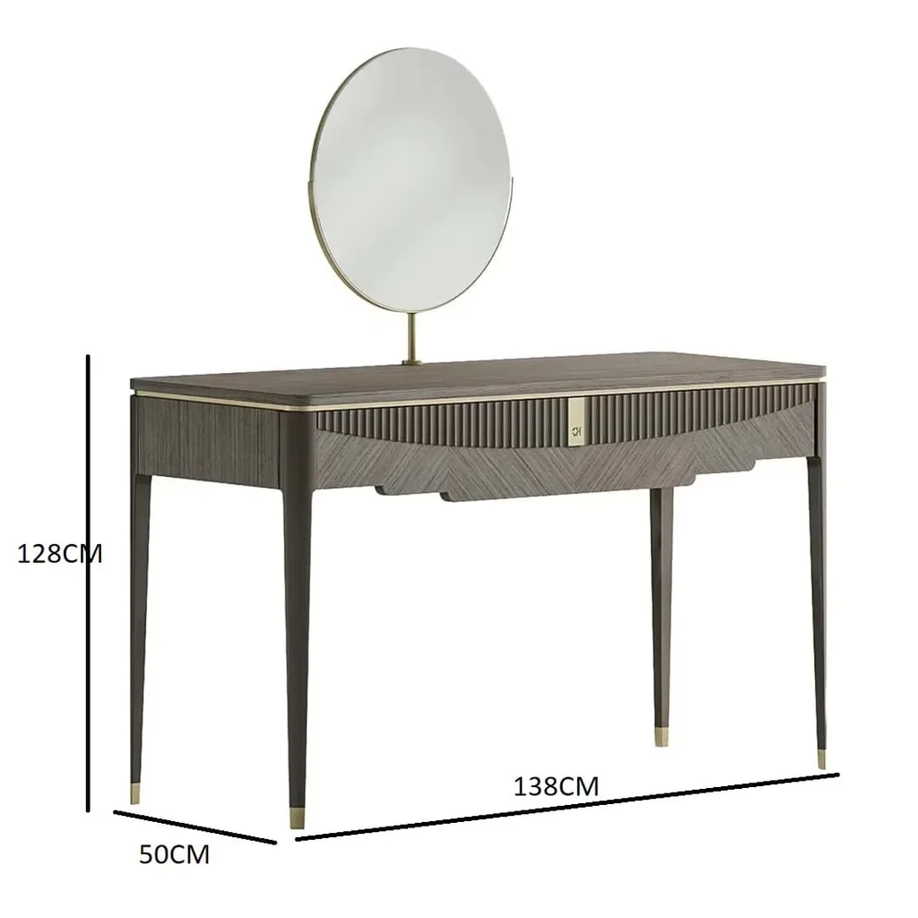تجمع هذه التسريحة العصرية الفاخرة بين الأناقة والعملية، لتكون إضافة مثالية لأي غرفة نوم أو ممر. مصنوعة من خشب طبيعي عالي الجودة يضمن المتانة والاستدامة، مما يجعلها قطعة تدوم لسنوات طويلة. يضفي اللون الرمادي الداكن بتفاصيل ذهبية لمسة من الفخامة والتميز، لتتحول التسريحة إلى عنصر ديكوري أنيق يعزز جمال المساحة. بفضل تصميمها العملي، توفر مساحة مثالية لتنظيم المستلزمات الشخصية مع الحفاظ على مظهر مرتب وأنيق.