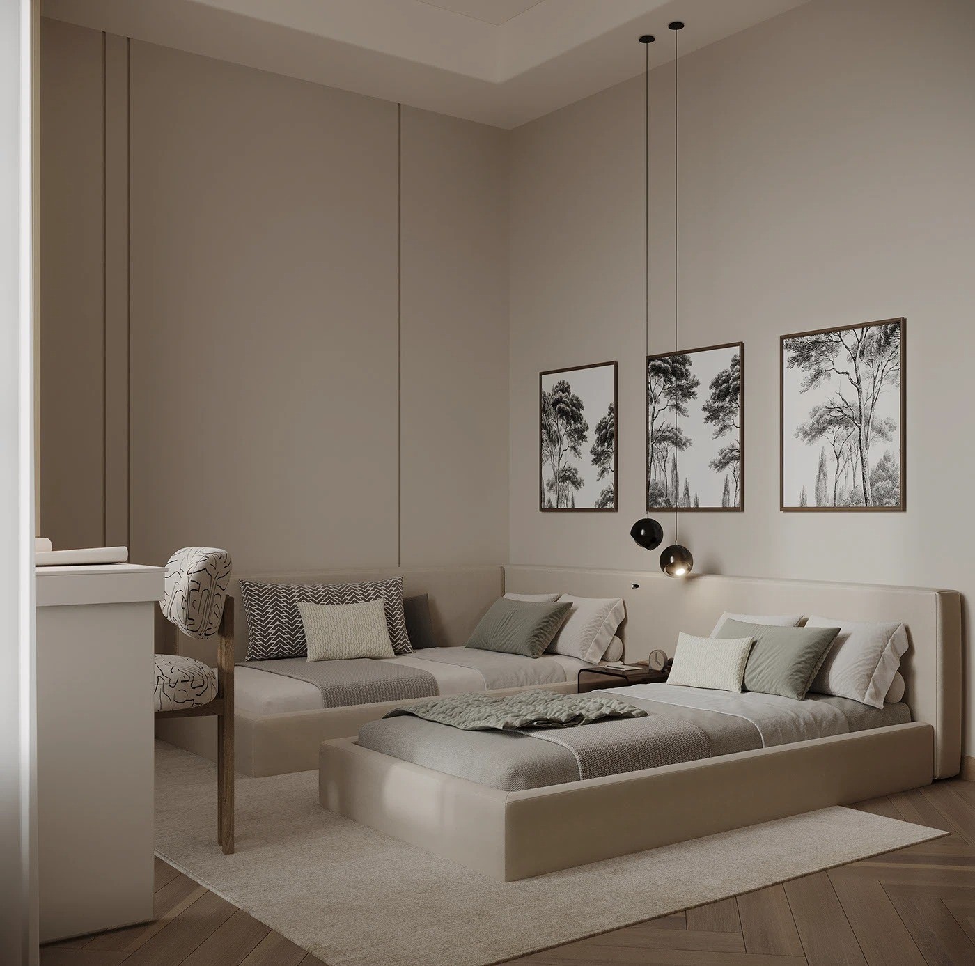 تتكون من سريرين منخفضين بجانب بعضهما مع رأس خلفي مستطيل مبطن بقماش فاخر بلون حيادي يضيف لمسة أنيقة.