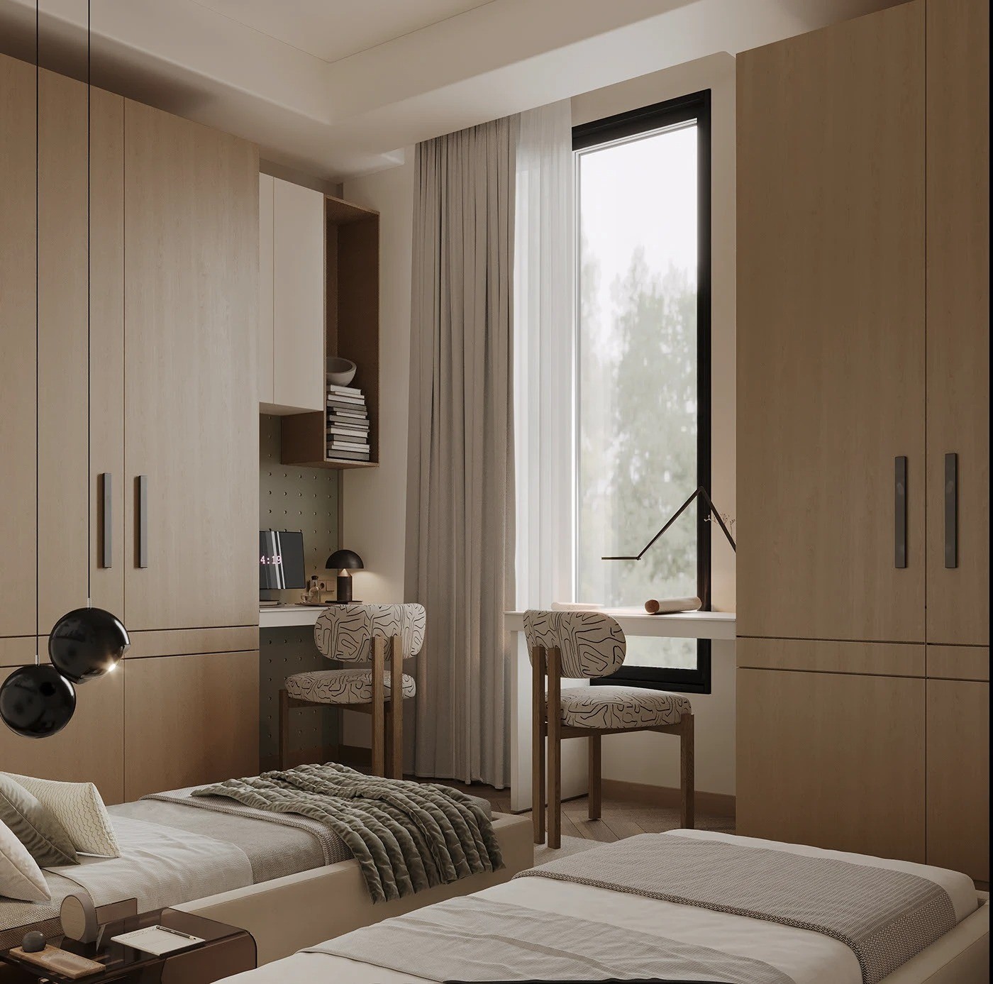 تضم الغرفة دولابين خشب طبيعي بتشطيب ناعم، بخطوط مستقيمة ومقابض طولية مدمجة، توفر حلول تخزين متعددة وتستغل المساحة بذكاء.