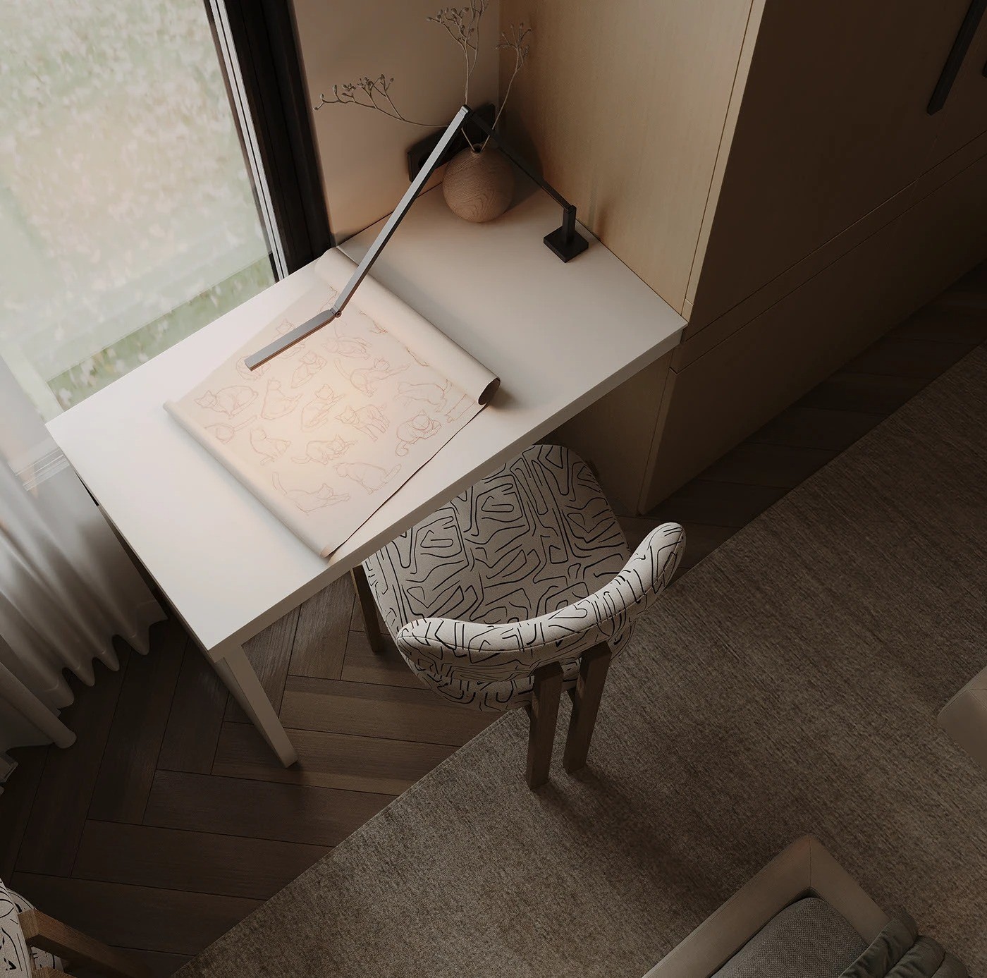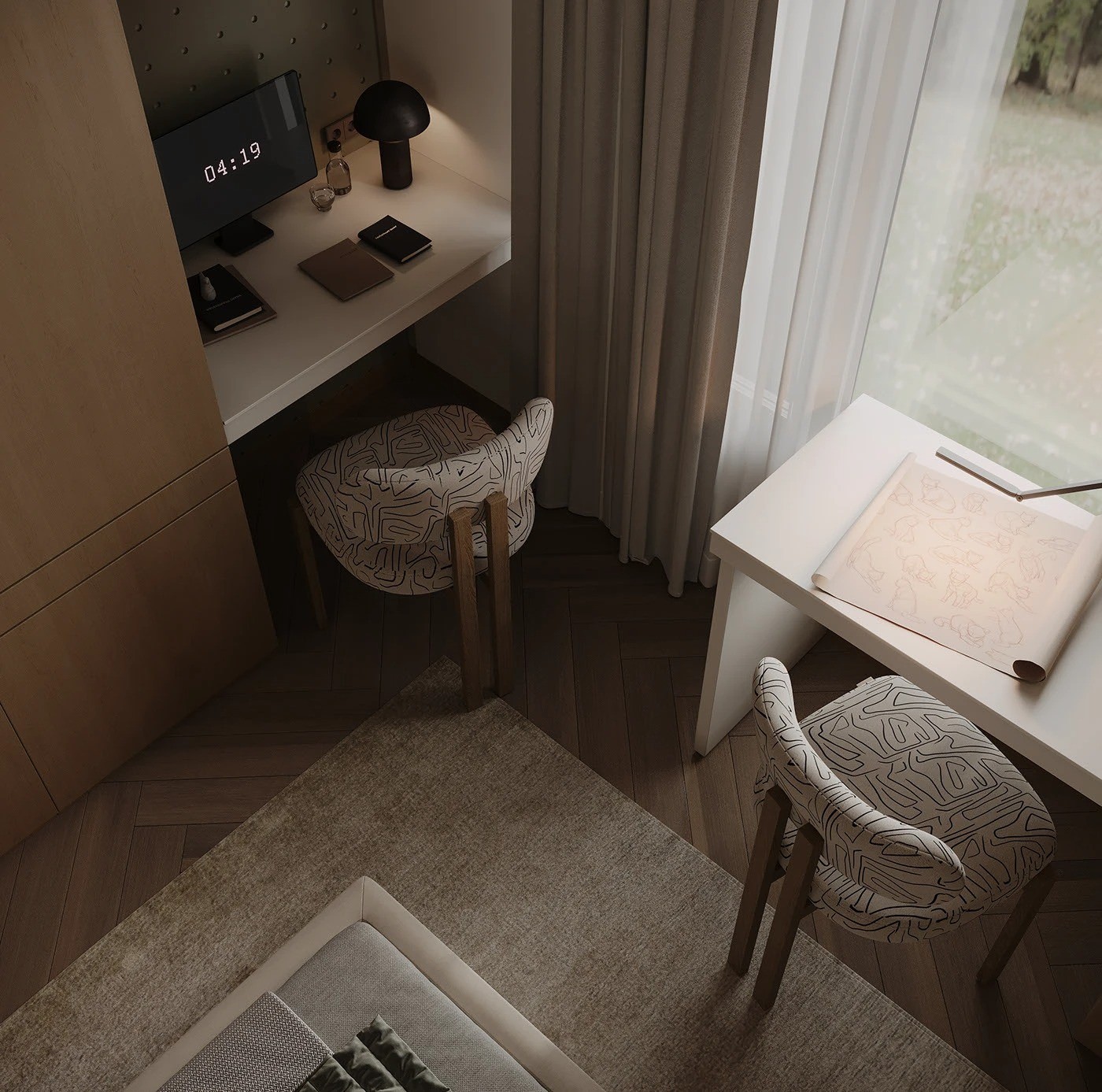 كما تشمل الغرفة كرسيين بتصميم بسيط ومريح، مزودين بوسادة منقوشة تضيف لمسة جمالية، مع أرجل خشبية متينة تعزز من الطابع العملي.