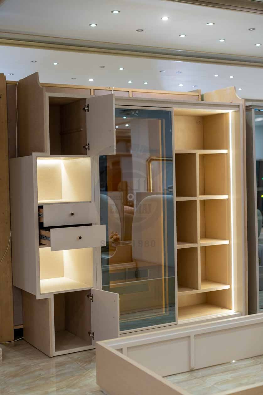 أما الدولاب الجرار الكبير بأبواب زجاجية وإضاءة داخلية LED فهو النقطة المحورية في الغرفة، حيث يمنح إحساساً بالرحابة والفخامة مع توفير مساحة منظمة لحفظ الملابس والأغراض بسهولة. كما يأتي بجانبه وحدة تخزين إضافية تحتوي على أرفف وأدراج عملية لزيادة المساحة والاستفادة المثلى من تصميم الغرفة.