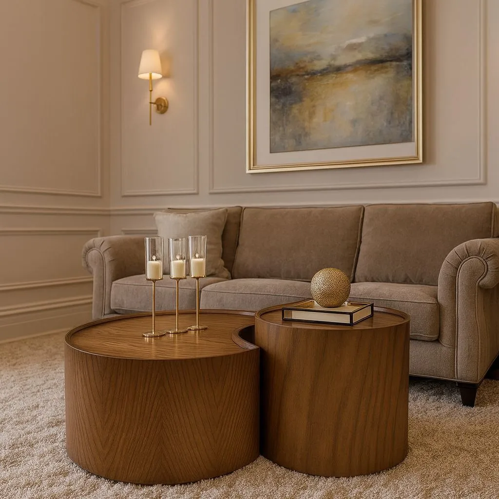 أضيفي لمسة من الدفء الطبيعي والأناقة العصرية لغرفة المعيشة مع طقم ترابيزات القهوة الدائري باللون الخشبي. يتكون الطقم من قطعتين دائريتين متناسقتين، يجمعان بين البساطة والانسيابية ليضفيا على المساحة لمسة متجددة تليق بمختلف أنماط الديكور.
