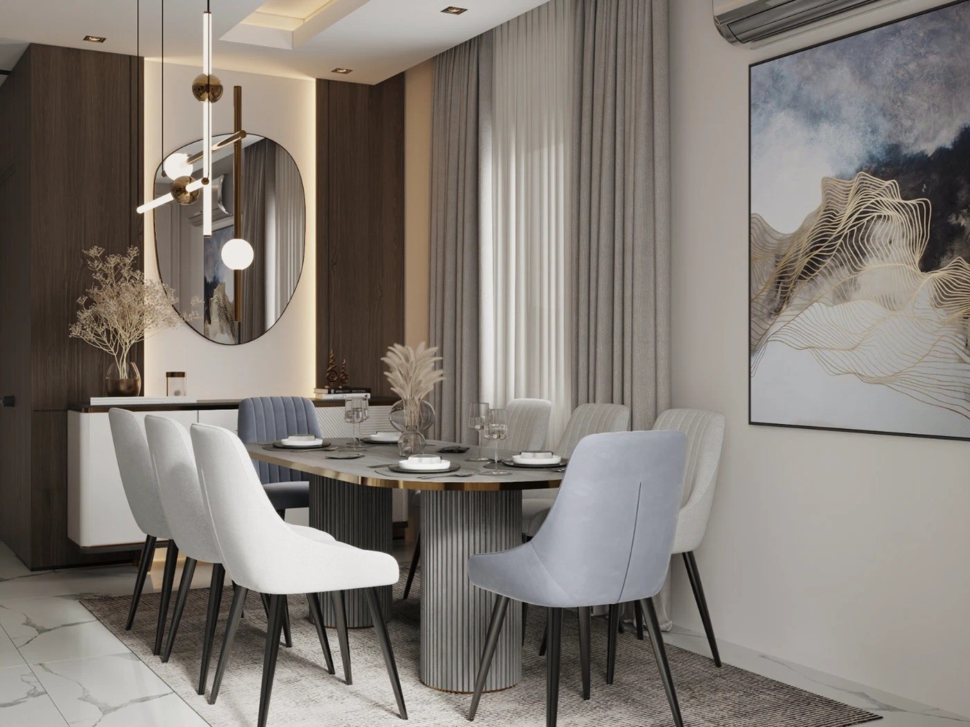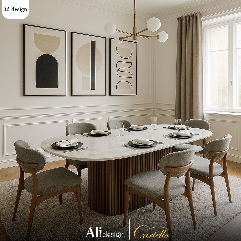 ترابيزة الطعام مصنوعة من خشب قوي مطلي باللون الرمادي مع لمسة ذهبية على السطح تضفي فخامة ورقي. القاعدة المخددة عموديًا تمنحها حضورًا مميزًا ولمسة نحتية تعكس الحرفية العالية.