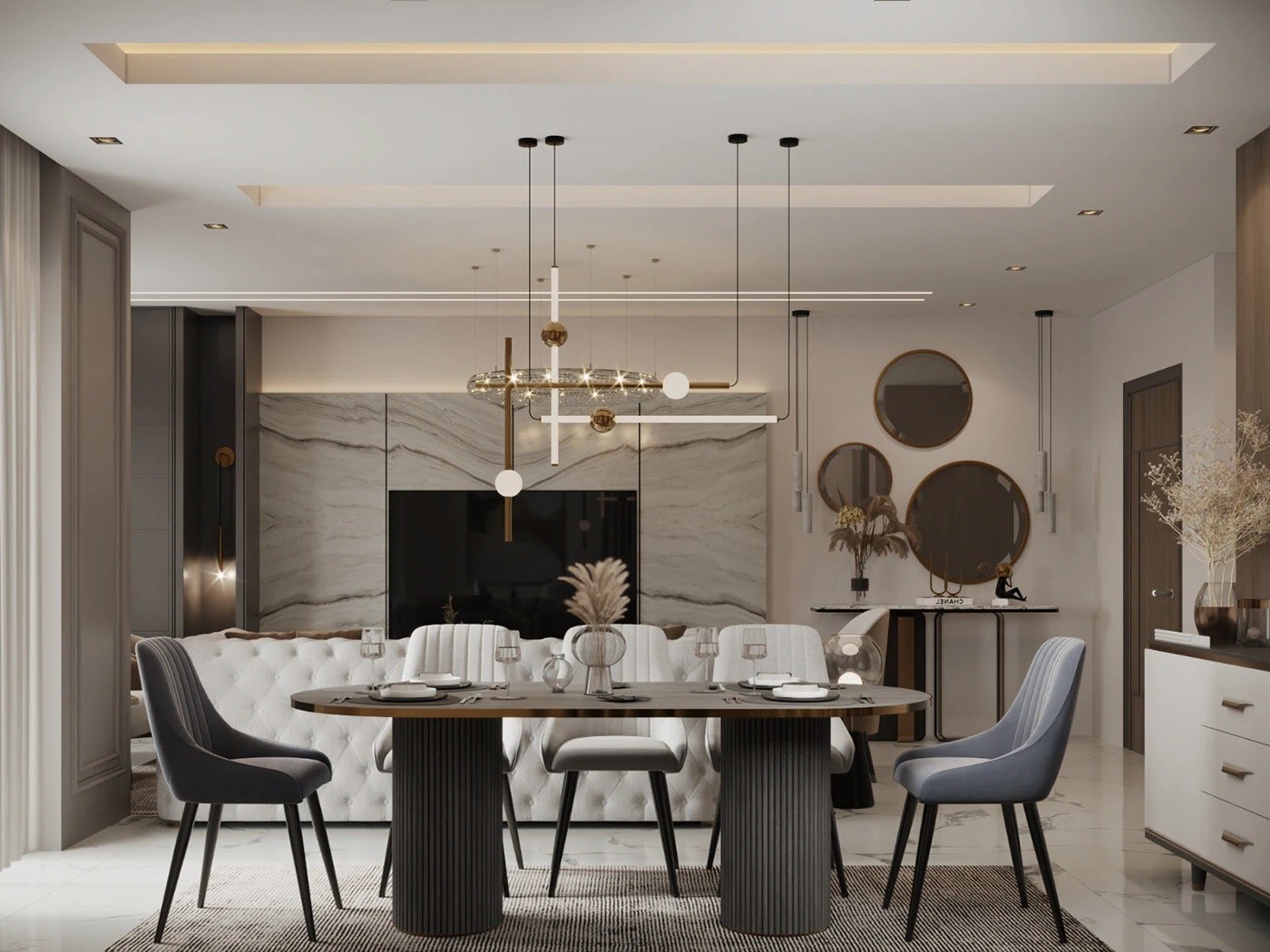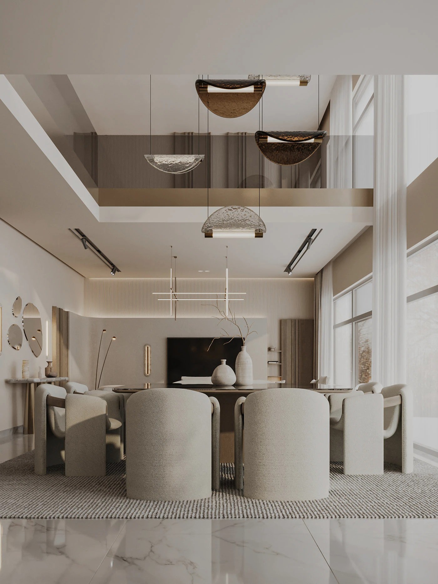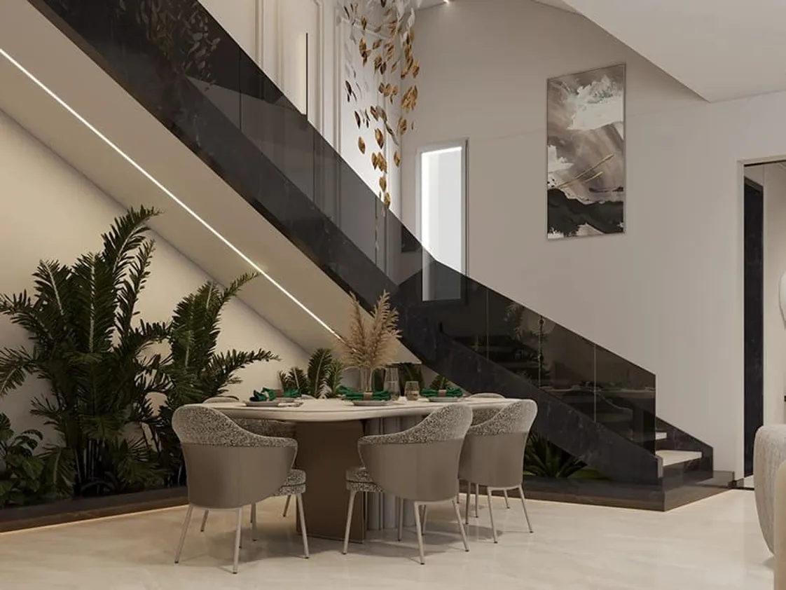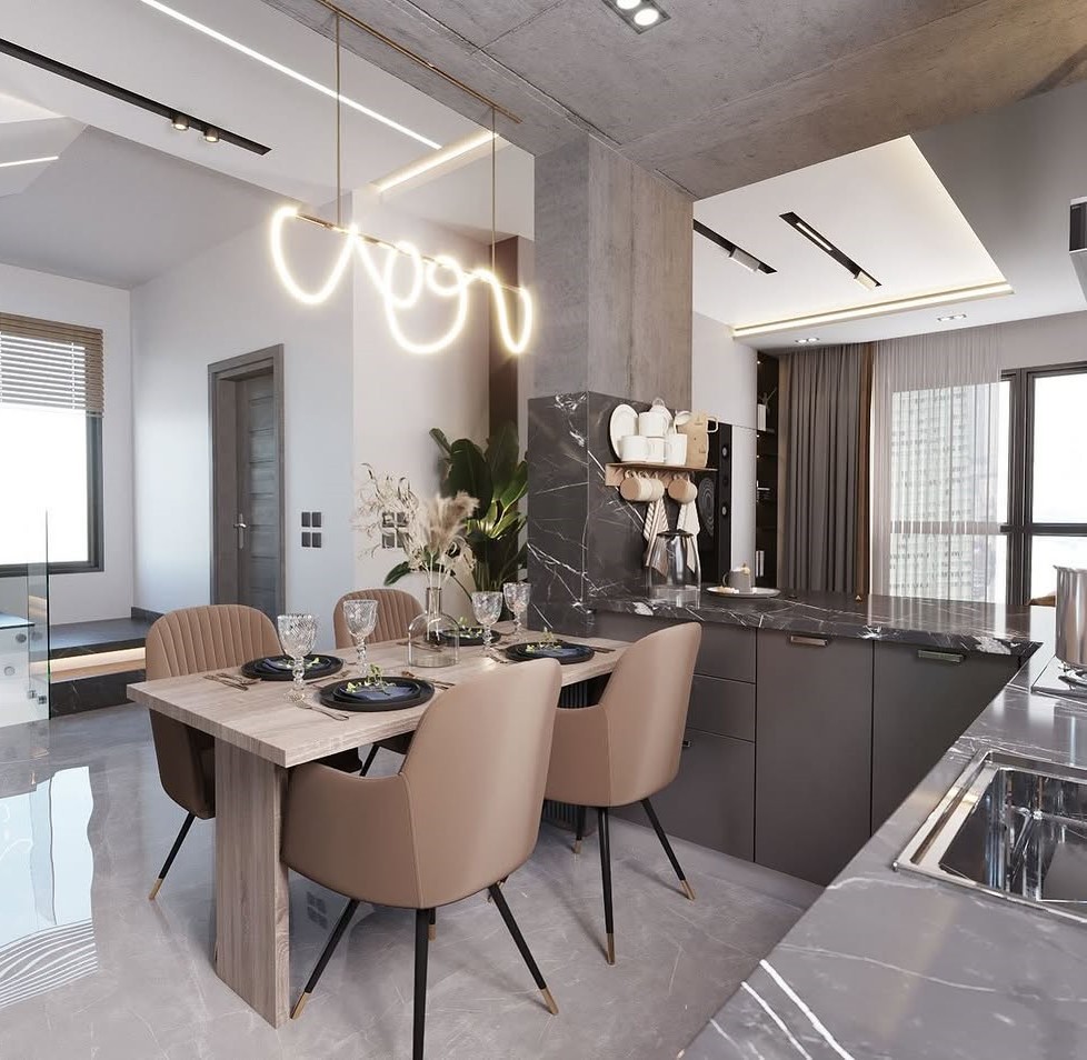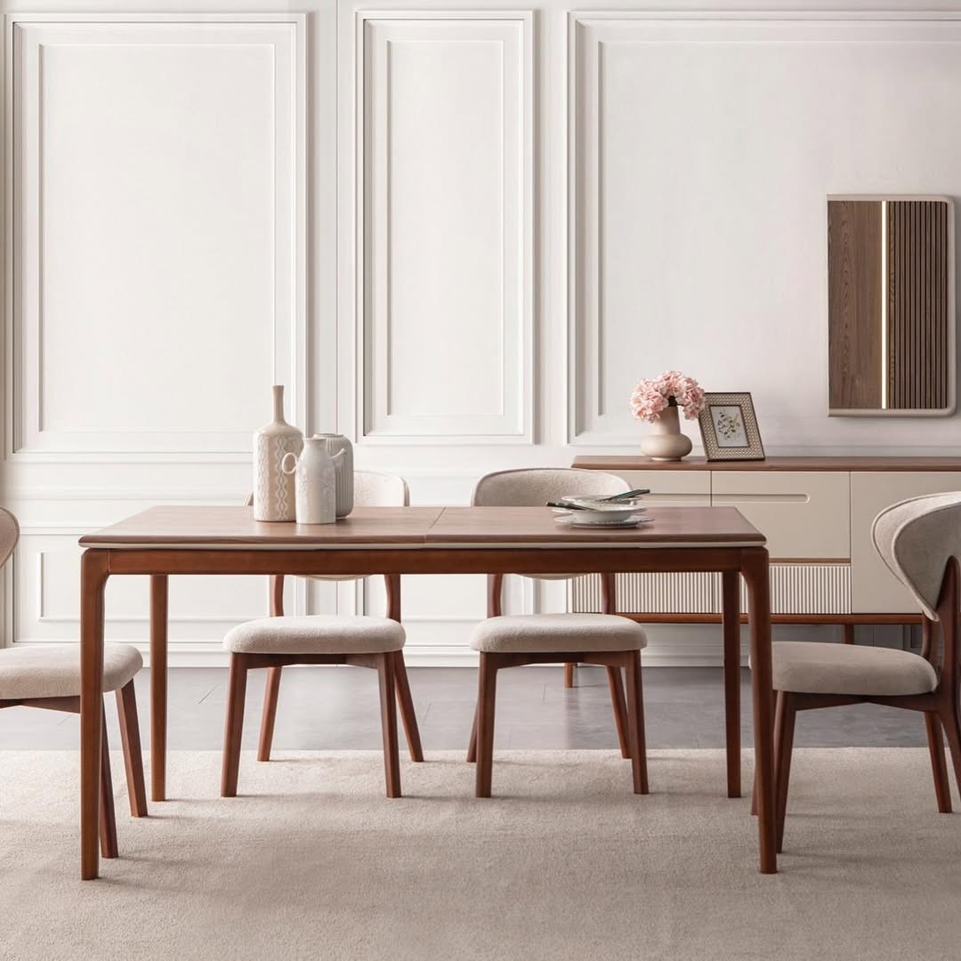 الكراسي مصممة بأسلوب يجمع بين الراحة والجمال، بــتنجيد مخملي رمادي فاتح لكرسيين والباقي أوف وايت، ما يخلق تباينًا أنيقًا ودافئًا. الظهر مبطن ومائل قليلاً للخلف لراحة مثالية، فيما تكمل الأرجل الخشبية السوداء ذات الخطوط المستقيمة الطابع العصري للتصميم.