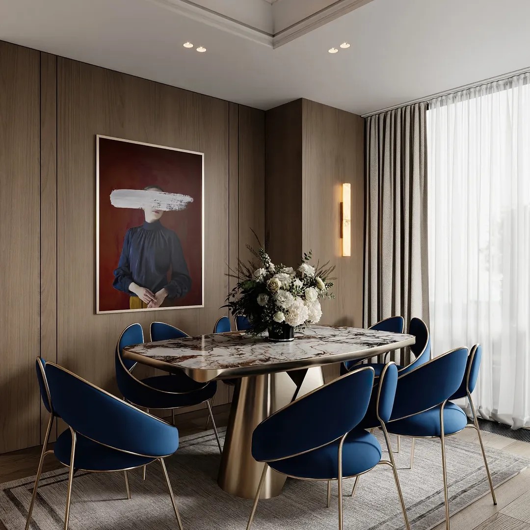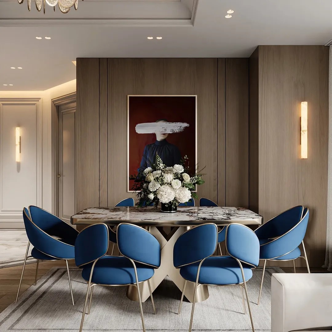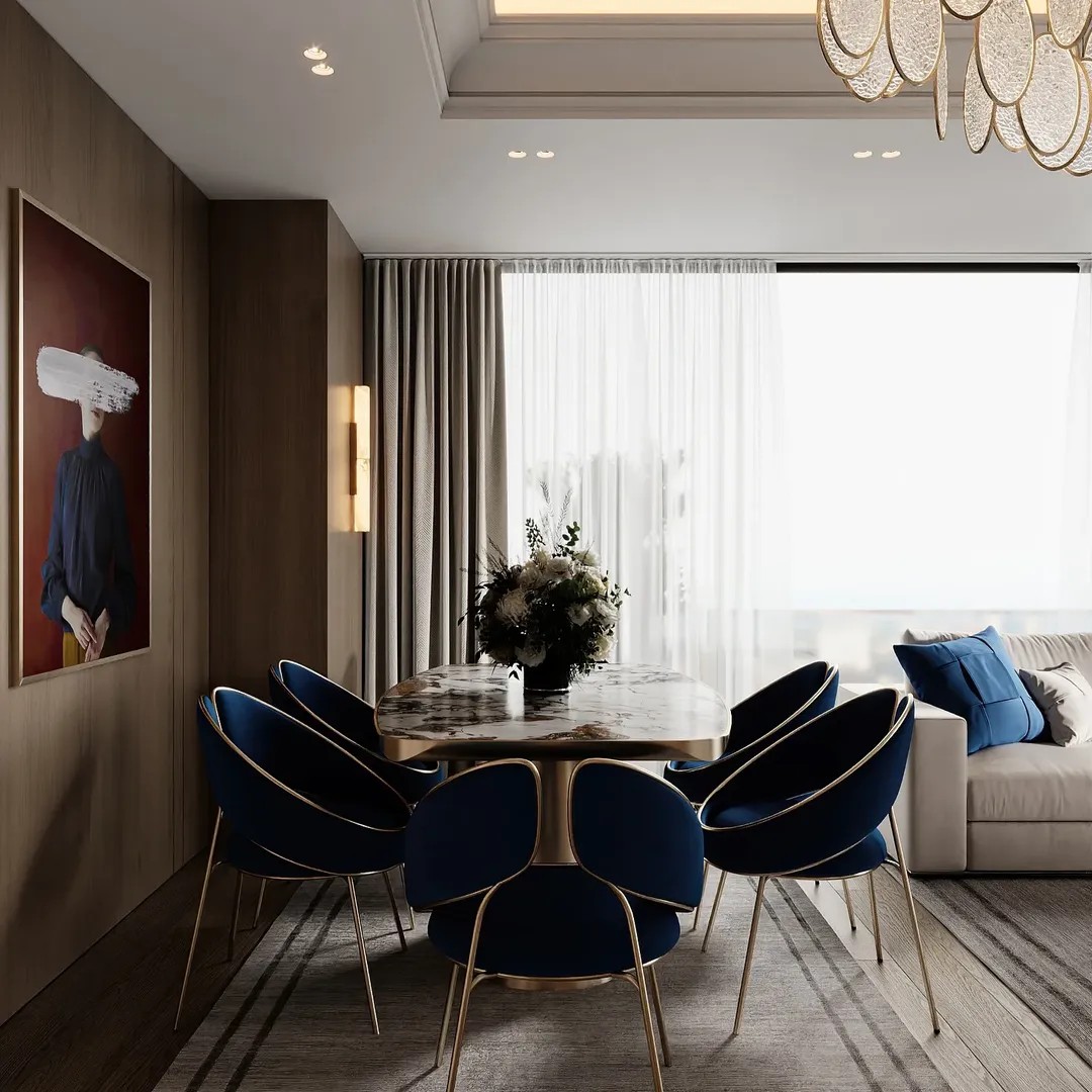 الكراسي بتنجيد مخملي أزرق داكن فاخر يضفي دفئًا ورقيًا، مع إطار معدني ذهبي متناغم مع قاعدة الترابيزة. تصميمها المريح بظهر منحني قليلًا ومقعد مبطن يجمع بين الأناقة والراحة المثالية.