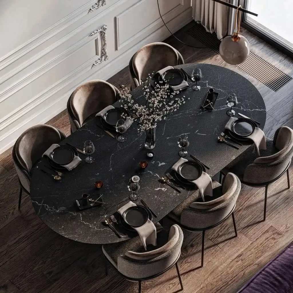 ترابيزة طعام بيضاوية بسطح رخامي أسود غير لامع بلمسة نهائية راقية. القاعدة الأسطوانية المخددة رأسيًا مصنوعة من الخشب الطبيعي باللون الأسود الداكن، ما يمنحها طابعًا نحتيًا متناسقًا مع السطح.