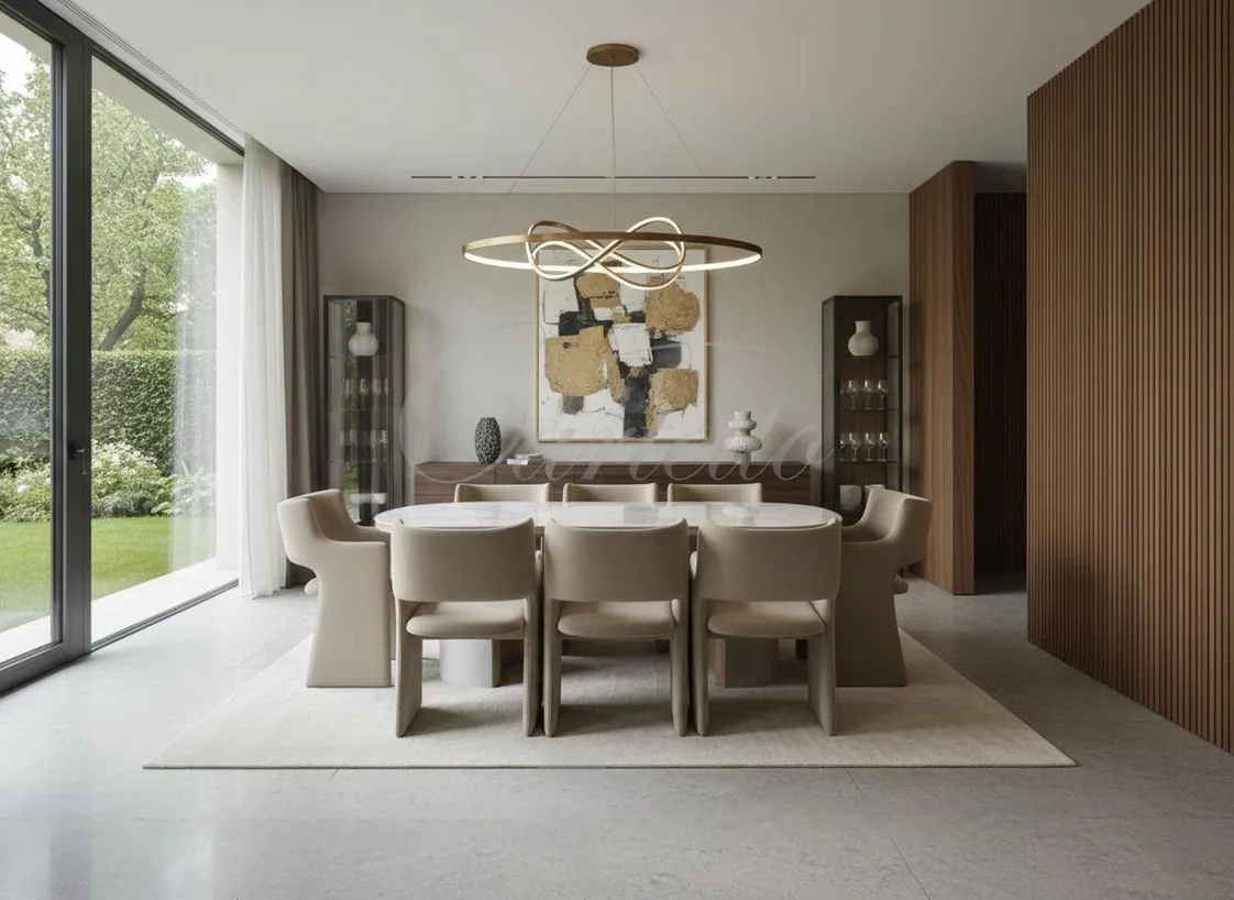 يتكامل التصميم مع بوفيه وخزائن بتشطيبات خشبية داكنة عملية وأنيقة، ما يوفر مساحة تخزين مثالية وأسلوب ديكور عصري راقٍ.