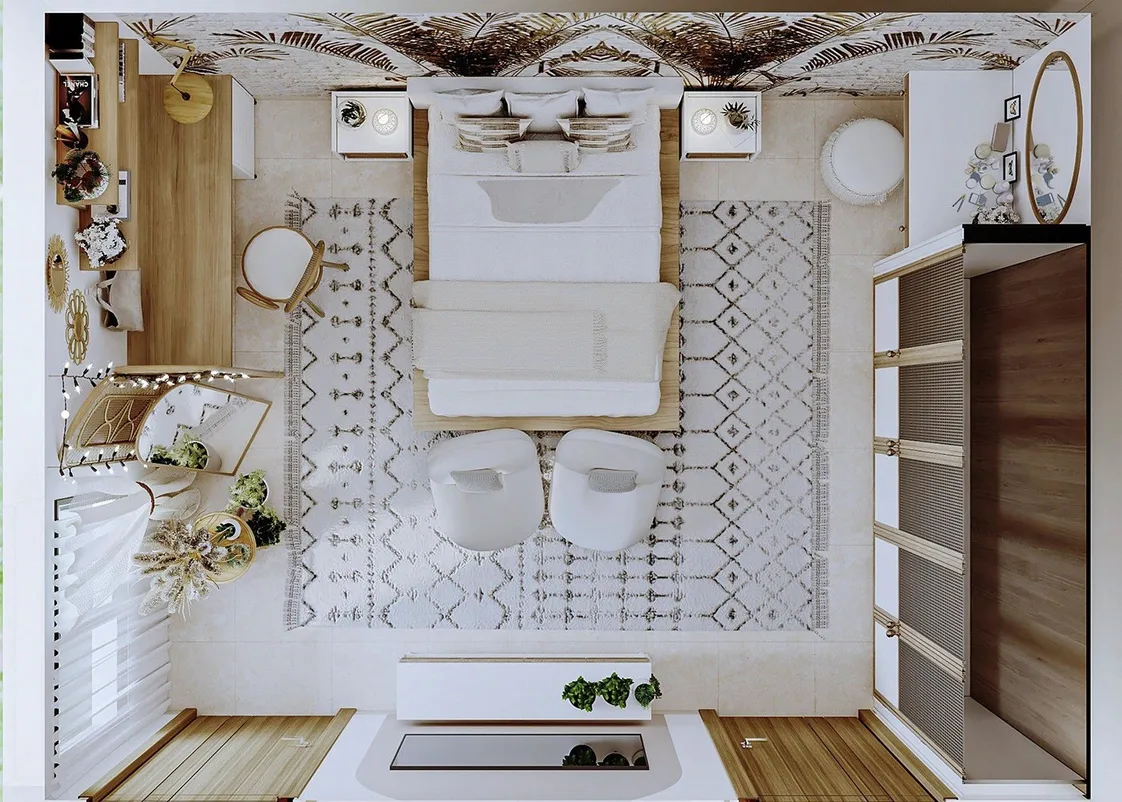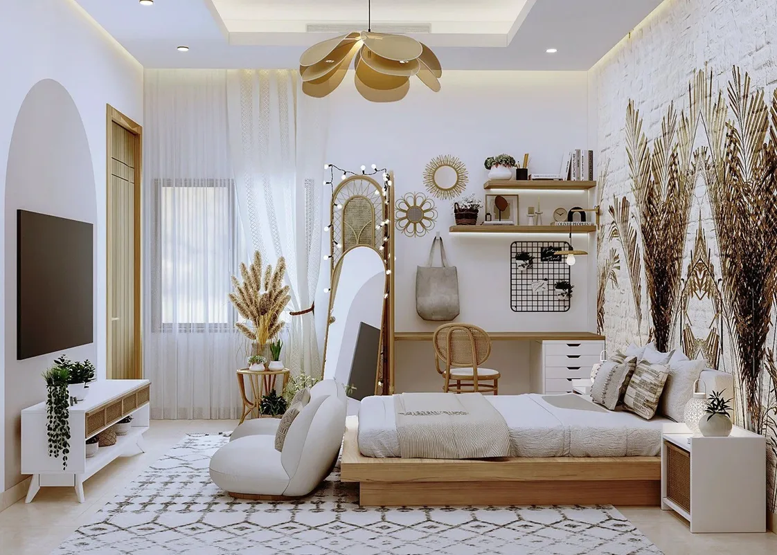غرفة نوم بتصميم عصري طبيعي هادئ تجمع بين البساطة والدفء.