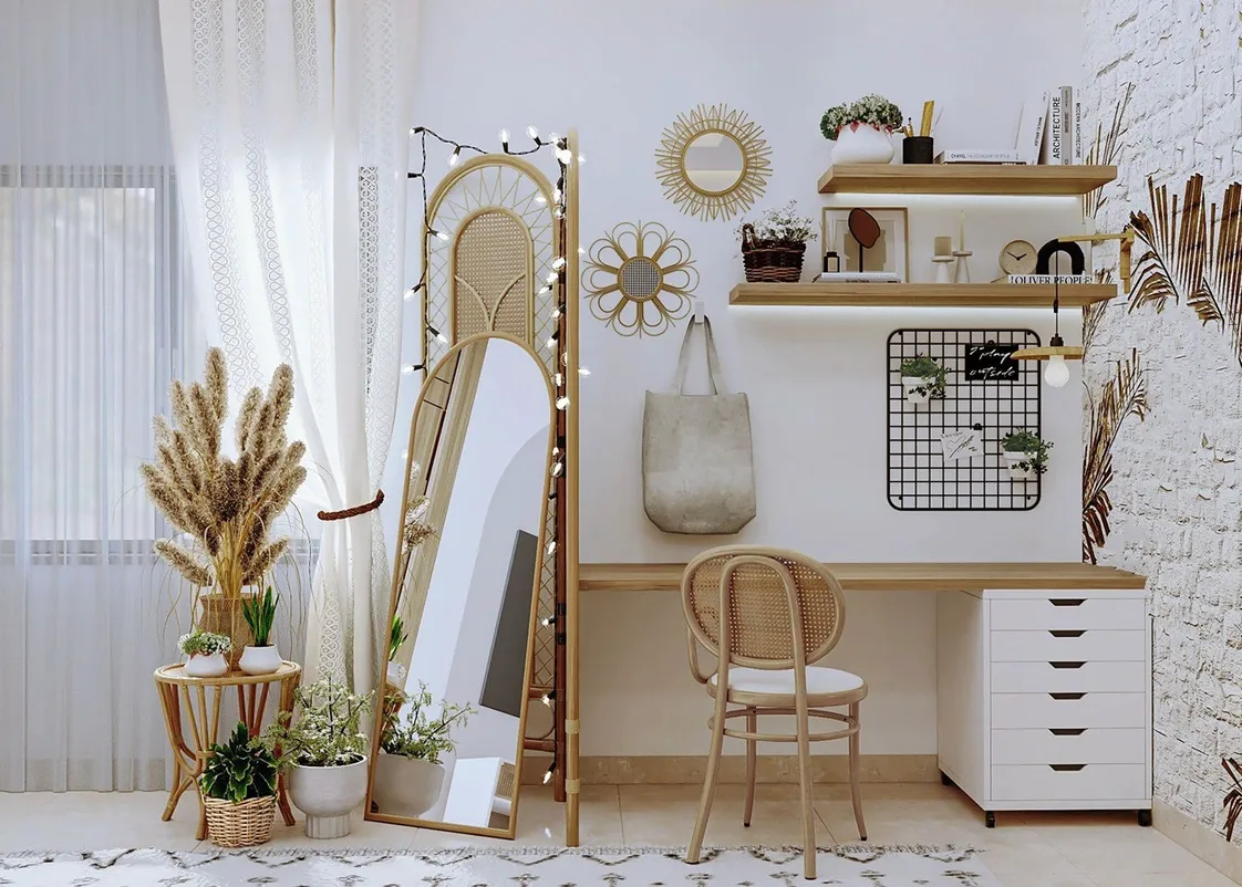 المكتب خشبي بلون فاتح مع سطح مستطيل ووحدة أدراج بيضاء عملية، والكرسي بخامة خيزران مجدول بتصميم دائري يبرز الطابع الطبيعي.