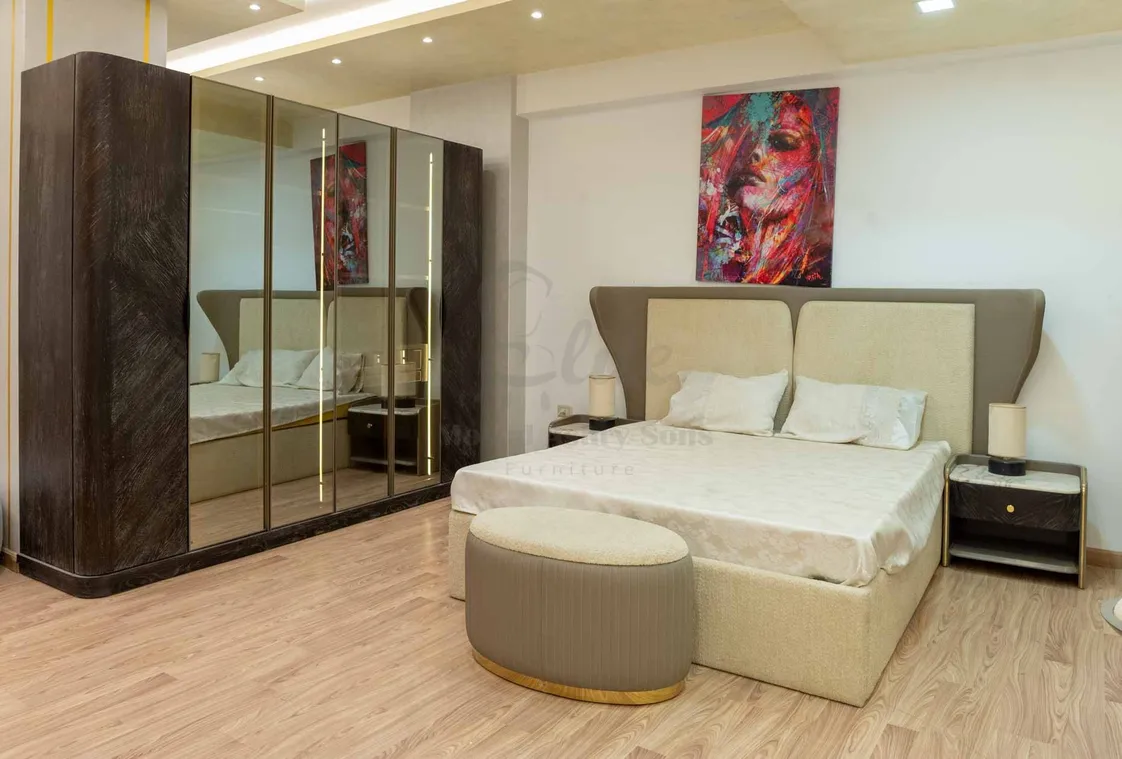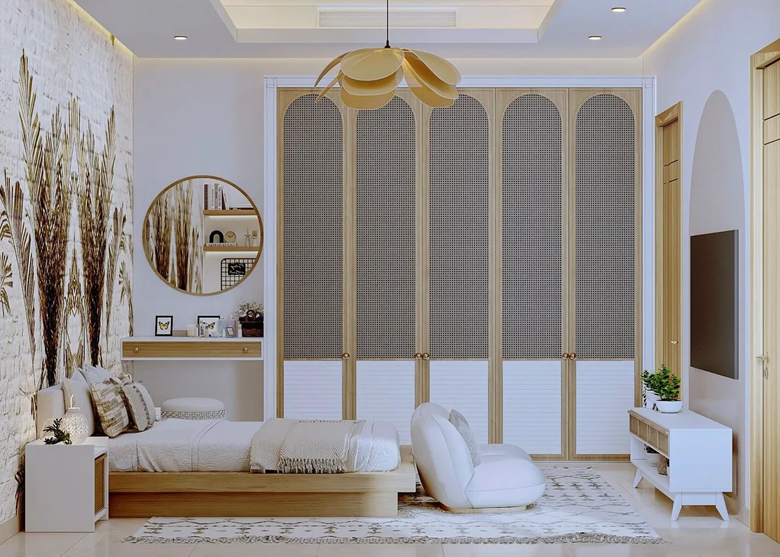 الدولاب بأبواب طويلة بدرجات البيج والأبيض مع واجهات خيزران منحنية، تصميم هادئ يدمج العصرية مع الطابع الطبيعي.
