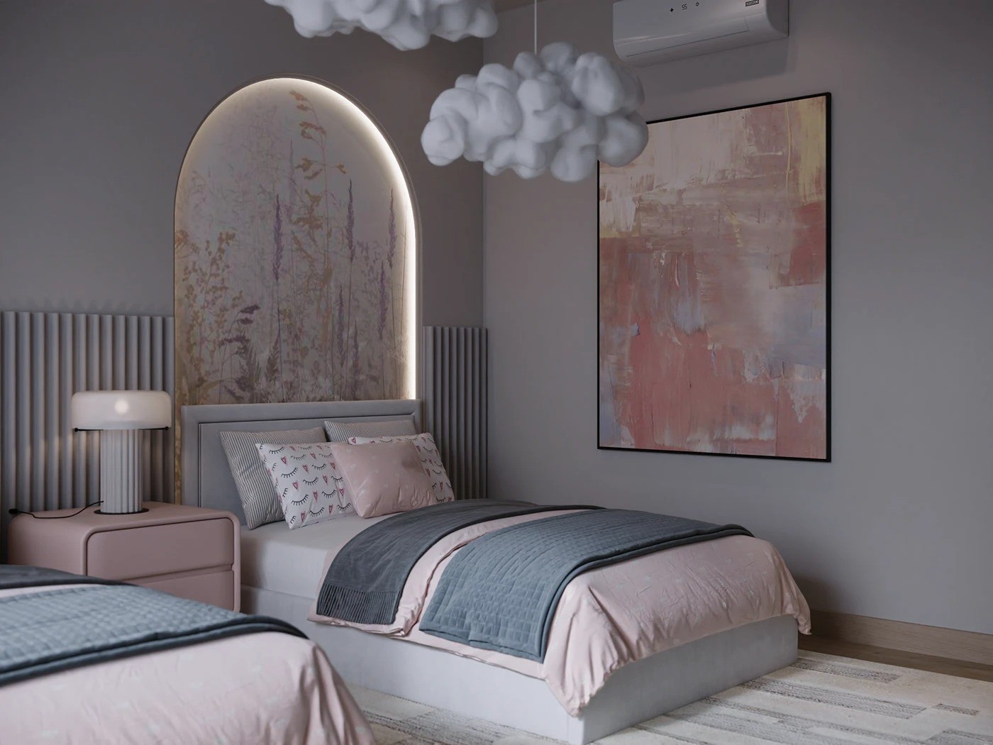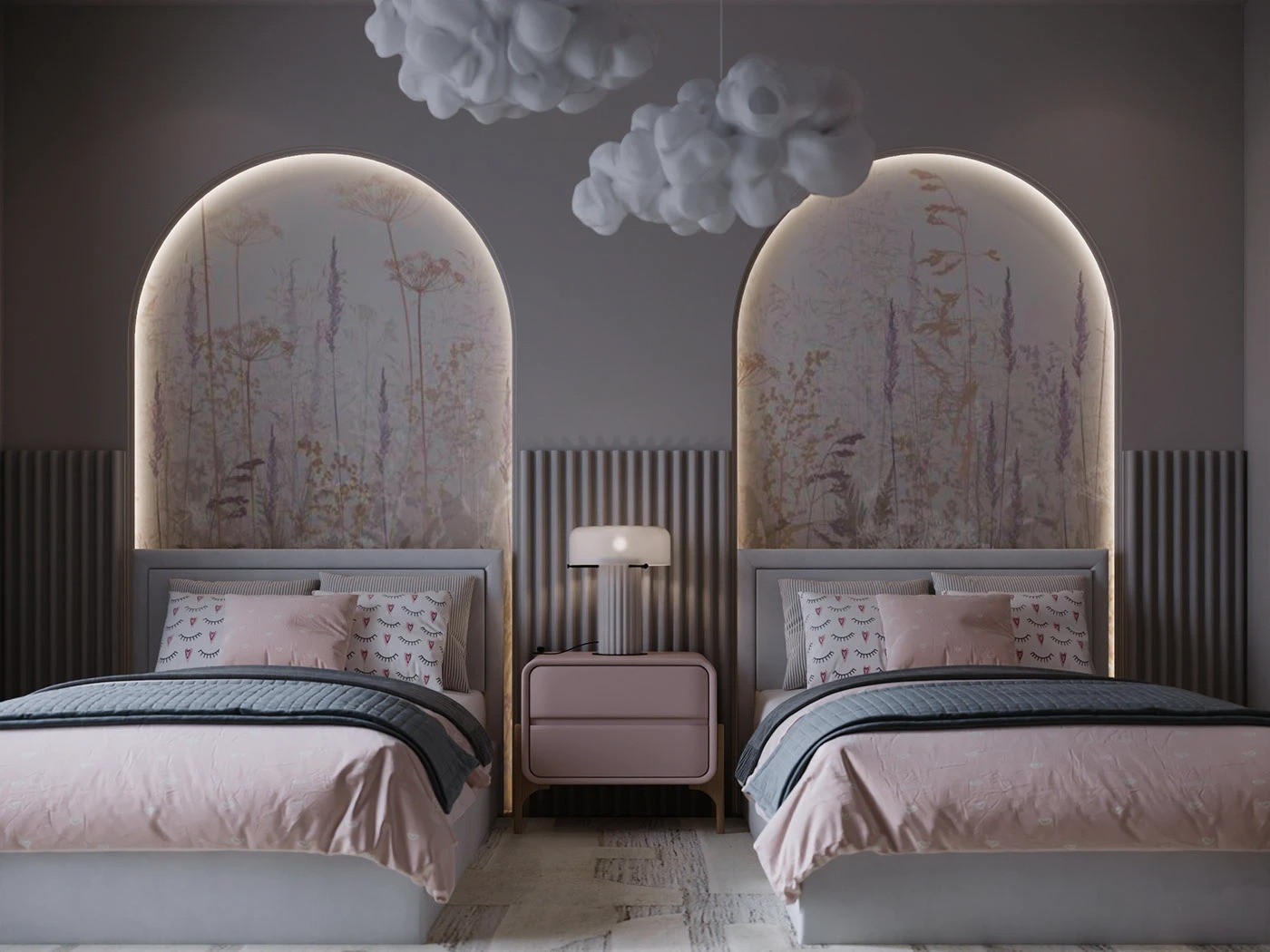 السريران بتصميم منخفض من الخشب المطلي باللون الرمادي الفاتح، مع لوح خلفي مستطيل بسيط يمنح حضورًا متوازنًا وهادئًا. الكومود الجانبي بلون وردي فاتح، بحواف ناعمة وقاعدة منخفضة، يحتوي على درجين بتشطيب أملس يعكس البساطة العصرية.