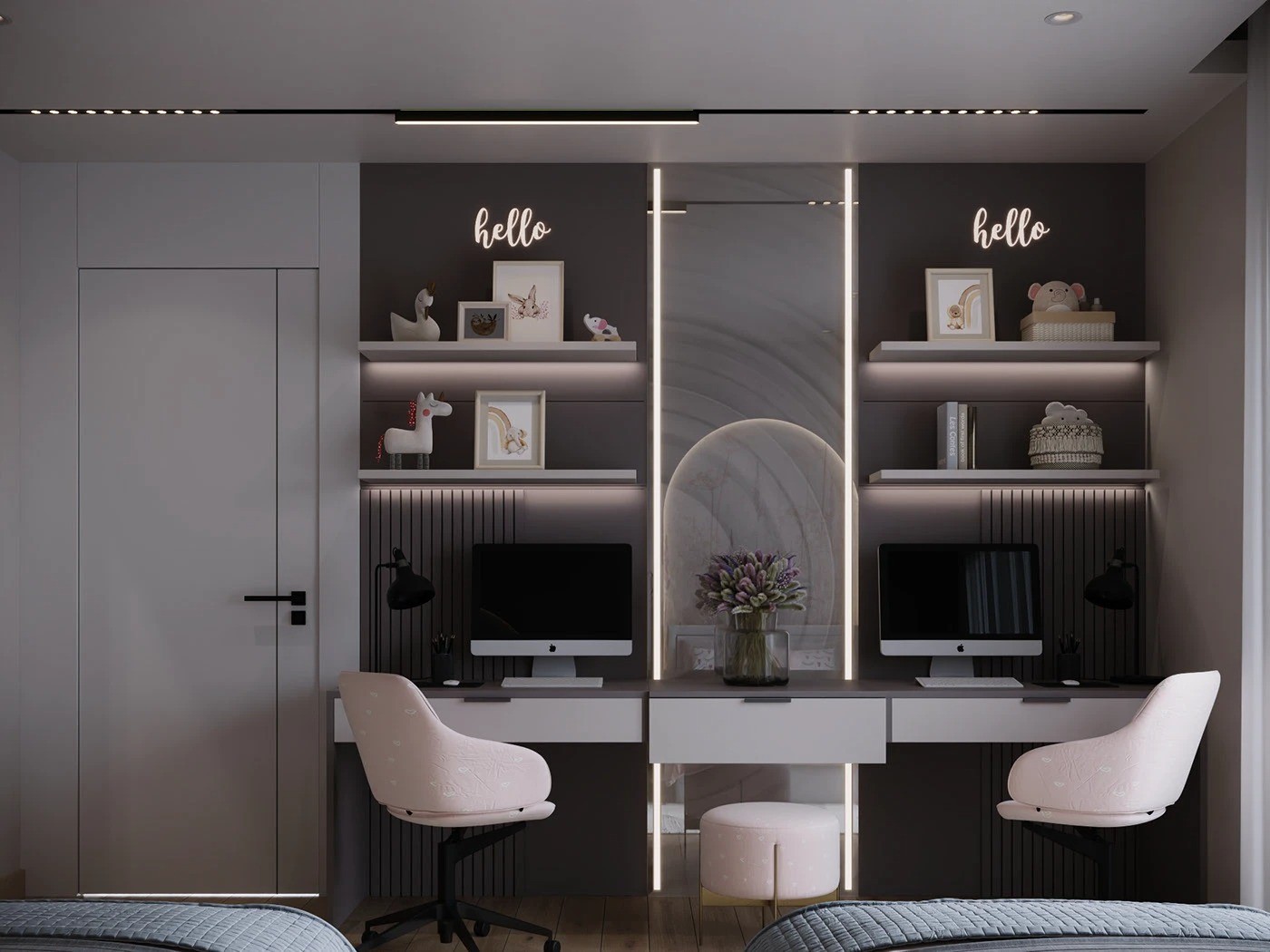 المكتبان متطابقان، بسطح خشبي رمادي داكن بتشطيب مطفأ، مزودين بدرج رمادي فاتح مع مقبض بارز، إضافة إلى وحدة أرفف علوية بخطوط مستقيمة عملية. الكراسي مزودة بقاعدة متينة وعجلات مرنة، مبطنة بقماش وردي هادئ يمنح توازنًا بين الراحة والعملية.