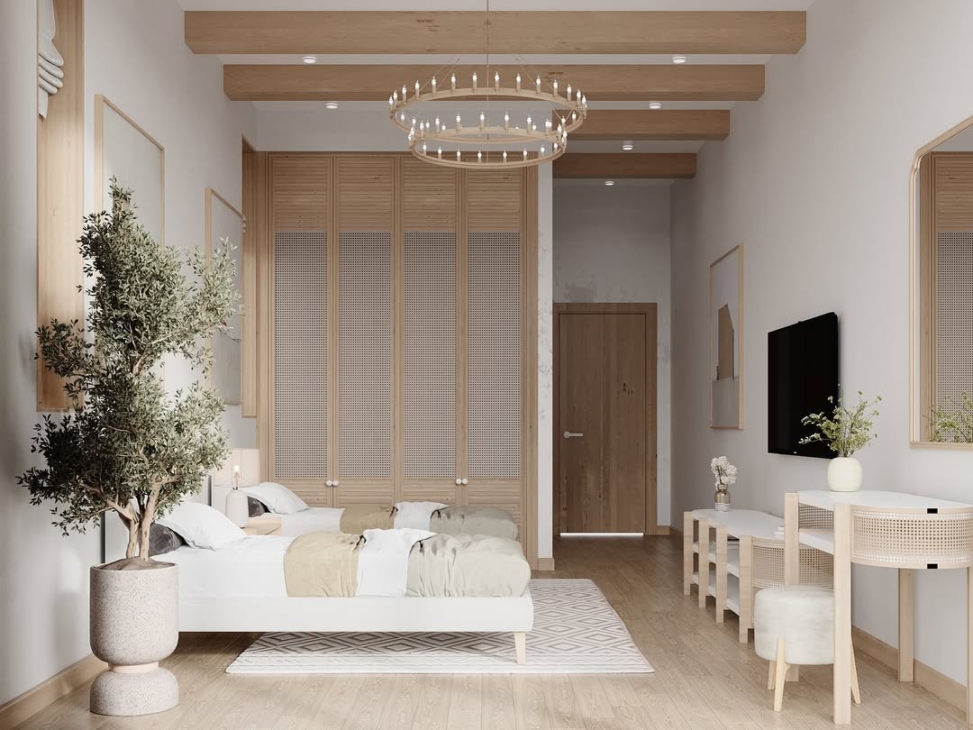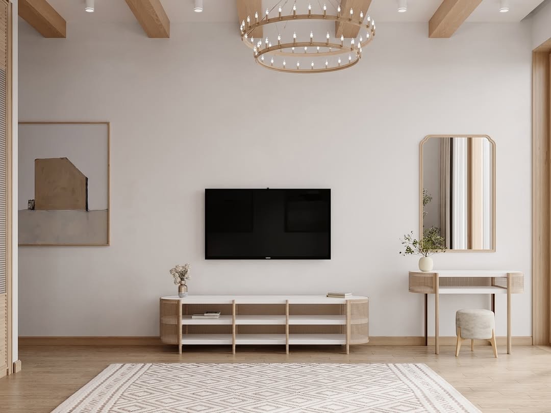 الدولاب بتصميم عصري بأبواب خشبية فاتحة مع تفاصيل من الخيزران ومقابض دائرية بيضاء، يعكس مظهرًا دافئًا وأنيقًا. التسريحة مصنوعة من الخشب الطبيعي بسطح أبيض وأرفف مفتوحة وأرجل خشبية طويلة مع لمسات من الخيزران، وتعلوها مرآة مستطيلة بإطار خشبي رفيع.