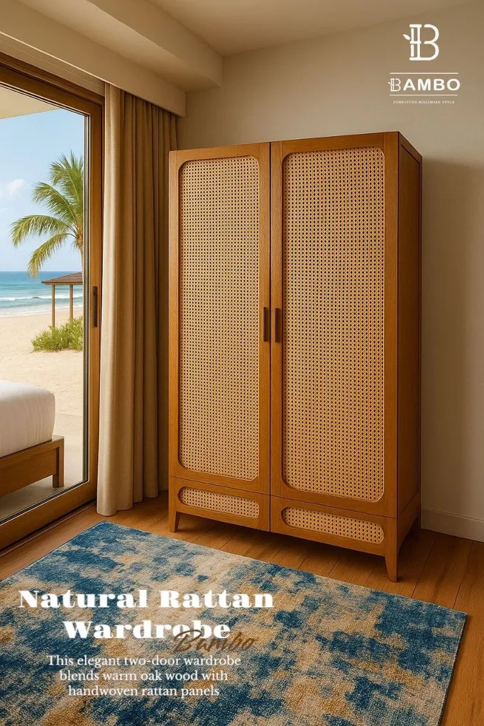 أضف لمسة دافئة ومليئة بالحيوية لغرفة أولادك مع هذا الدولاب العصري المستوحى من أسلوب البوهو المميز. يجمع التصميم بين الخشب الطبيعي والكانية المنسوجة لتقديم قطعة فريدة تعكس البساطة والعملية في آن واحد.