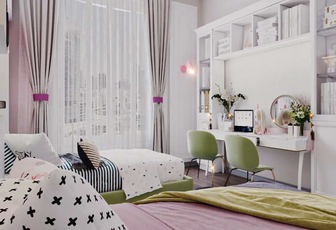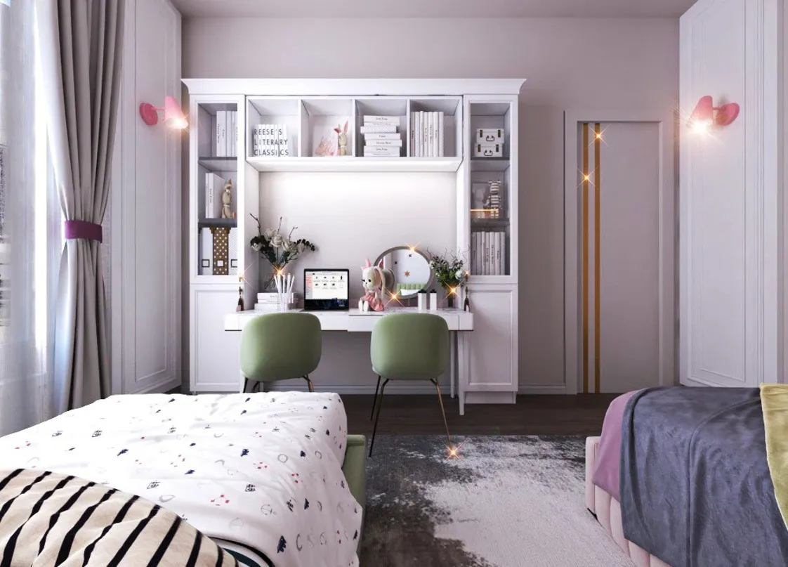 وحدة التخزين العلوية مدمجة بالجدار باللون الأبيض، مزودة بخزائن مغلقة وفتحات عرض ملونة بالوردي والأخضر مع رفوف لعرض الكتب والألعاب. المكتب بلون أبيض نقي مع سطح واسع يكفي لشخصين، يحتوي على درجين مدمجين ورفوف علوية منظمة.