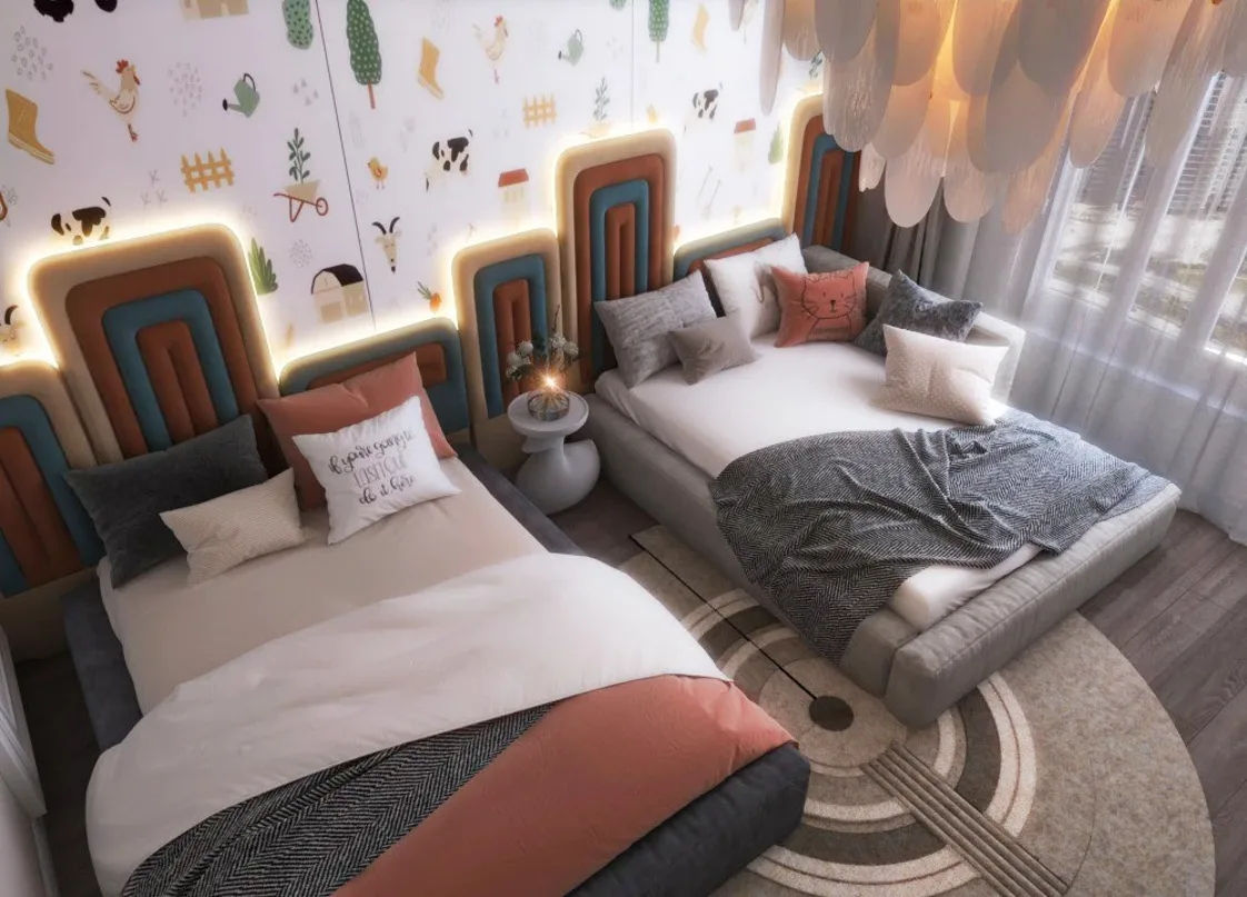 السريران متجاوران بهيكل منجد بالكامل باللون الرمادي، أحدهما بدرجة فاتحة والآخر داكنة، مع إطار جانبي منخفض ولوح خلفي هندسي متعدد الطبقات مثبت على الحائط. الألواح تأتي بألوان متناسقة مثل الأزرق البترولي والبني والبيج، مع إضاءة مدمجة تضفي طابعًا زخرفيًا مبتكرًا.