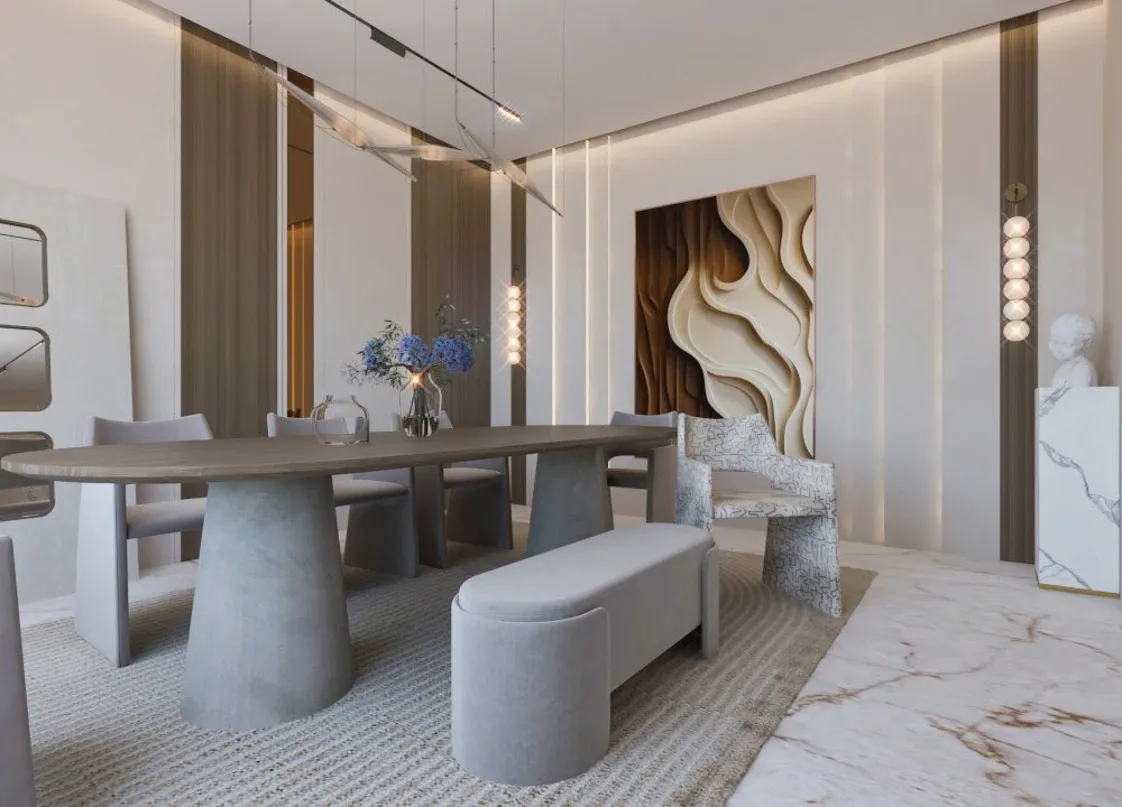 الكراسي المحيطة مصممة بخطوط مستقيمة وظهر متوسط الارتفاع، منجدة بقماش فاخر باللون الرمادي الفاتح لراحة إضافية ومظهر متناسق. يتكامل معها مقعد طويل بنفس اللون والتنجيد لإضافة لمسة عصرية عملية. كما يبرز كرسي جانبي بتصميم فني منقوش بدرجات الأبيض والرمادي ليمنح المجموعة لمسة جمالية فريدة.