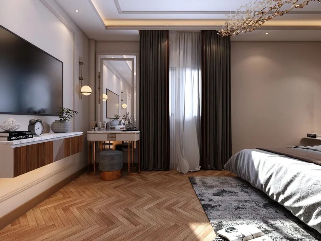 غرفة نوم بتصميم عصري فاخر يجمع بين الأناقة والراحة.