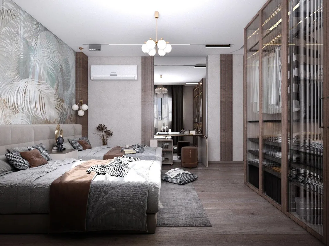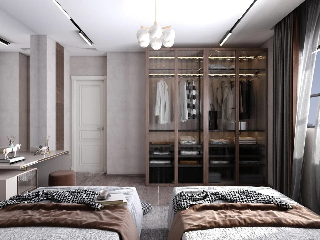 الدولاب العصري بأبواب زجاجية شفافة وإطار خشبي داكن، مجهز بقضبان لتعليق الملابس وأرفف للتخزين المنظم، مع مقابض معدنية رفيعة أنيقة.