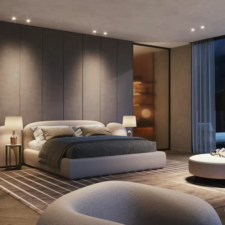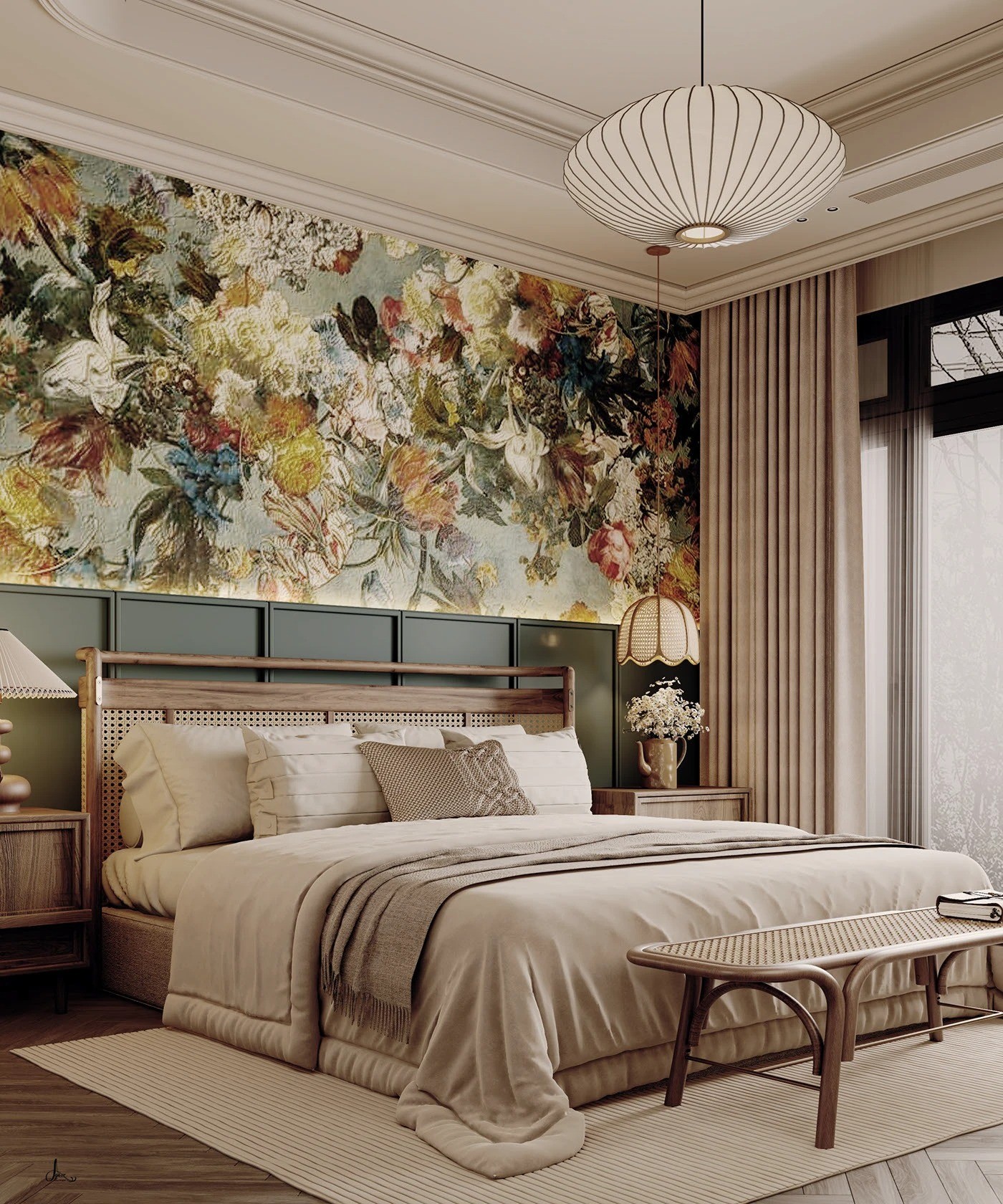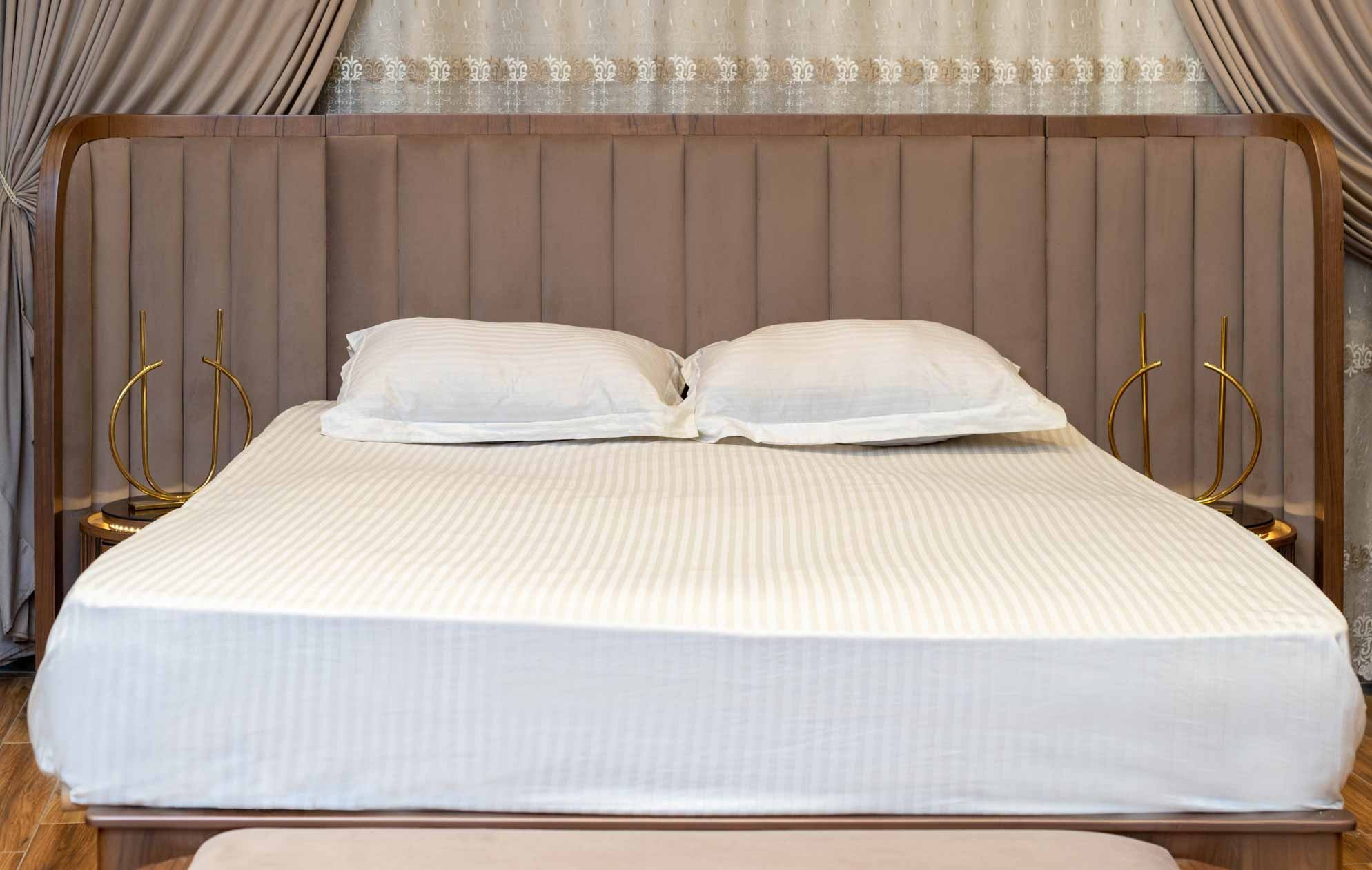البانكيت: مصنوع من الخشب الطبيعي بلون السرير نفسه، ومقعده منسوج بالخيزران ليتناغم مع تصميم اللوح الخلفي للسرير. الإطار والأرجل خشبية بلون دافئ، والأطراف منحنية برقة، مما يعزز الانسيابية ويخلق توازنًا واضحًا بين الراحة والجمال.